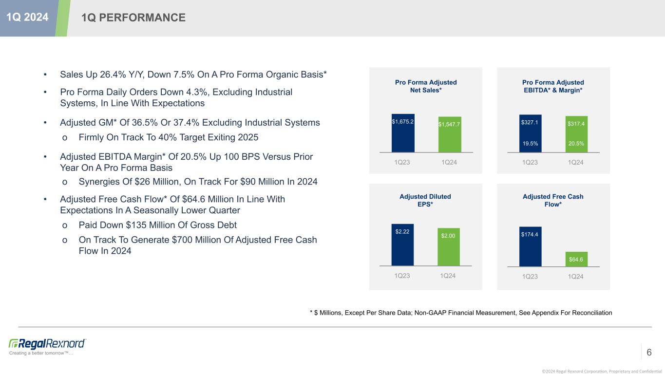 ©2024 Regal Rexnord Corporation, Proprietary and Confidential Creating a better tomorrow™… NON-GAAP FINANCIAL MEASURES 3 1Q 2024 We prepare our financial statements in accordance with accounting principles generally accepted in the United States of America (“GAAP”). We also periodically disclose certain financial measures in our quarterly earnings releases, on investor conference calls, and in investor presentations and similar events that may be considered “non- GAAP” financial measures. This additional information is not meant to be considered in isolation or as a substitute for our results of operations prepared and presented in accordance with GAAP. In this release, we disclose the following non-GAAP financial measures, and we reconcile these measures in the tables below to the most directly comparable GAAP financial measures: adjusted diluted earnings per share, adjusted income from operations, adjusted operating margin, adjusted net sales, adjusted gross margin, pro forma adjusted gross margin, net debt, EBITDA, adjusted EBITDA, pro forma EBITDA, pro forma adjusted EBITDA, adjusted EBITDA (including synergies), interest coverage ratio, interest coverage ratio (including synergies), adjusted EBITDA margin, gross debt/ adjusted EBITDA, net debt/adjusted EBITDA, net debt/adjusted EBITDA (including synergies),adjusted cash flows from operations, adjusted free cash flow, adjusted income before taxes, adjusted provision for income taxes, and adjusted effective tax rate. We believe that these non-GAAP financial measures are useful measures for providing investors with additional information regarding our results of operations and for helping investors understand and compare our operating results across accounting periods and compared to our peers. Our management primarily uses adjusted income from operations and adjusted operating margin to help us manage and evaluate our business and make operating decisions, while the other non-GAAP measures disclosed are primarily used to help us evaluate our business and forecast our future results. Accordingly, we believe disclosing and reconciling each of these measures helps investors evaluate our business in the same manner as management. This release also includes non-GAAP forward-looking information. The Company believes that a quantitative reconciliation of this forward-looking information to the most comparable financial measure calculated and presented in accordance with GAAP cannot be made available without unreasonable efforts. A reconciliation of this non- GAAP financial measure would require the Company to predict the timing and likelihood of future restructurings and other charges. Neither these forward-looking measures, nor their probable significance, can be quantified with a reasonable degree of accuracy. Accordingly, a reconciliation of the most directly comparable forward-looking GAAP measure is not provided. In addition to these non-GAAP measures, we use the term “organic sales growth” and "pro forma organic sales growth" to refer to the increase in our sales between periods that is attributable to organic sales. “Organic sales” refers to GAAP sales from existing operations excluding any sales from acquired businesses recorded prior to the first anniversary of the acquisition and excluding any sales from business divested/to be exited recorded prior to the first anniversary of the exit and excluding the impact of foreign currency translation. “Pro forma organic sales” refers to "organic sales" giving effect to the acquisition of Altra. The impact of foreign currency translation is determined by translating the respective period’s organic sales using the currency exchange rates that were in effect during the prior year periods. The assumptions and related pro forma adjustments in the selected financial information presented within this release are consistent with those presented in the Company's Current Reports on Form 8-K filed on June 5, 2023 and September 8, 2023 giving effect to the acquisition of Altra and related transactions and are inclusive of the measurement period adjustments included in the Company's Annual Report on Form 10-K for the fiscal year ended December, 31 2023 on file with the SEC.