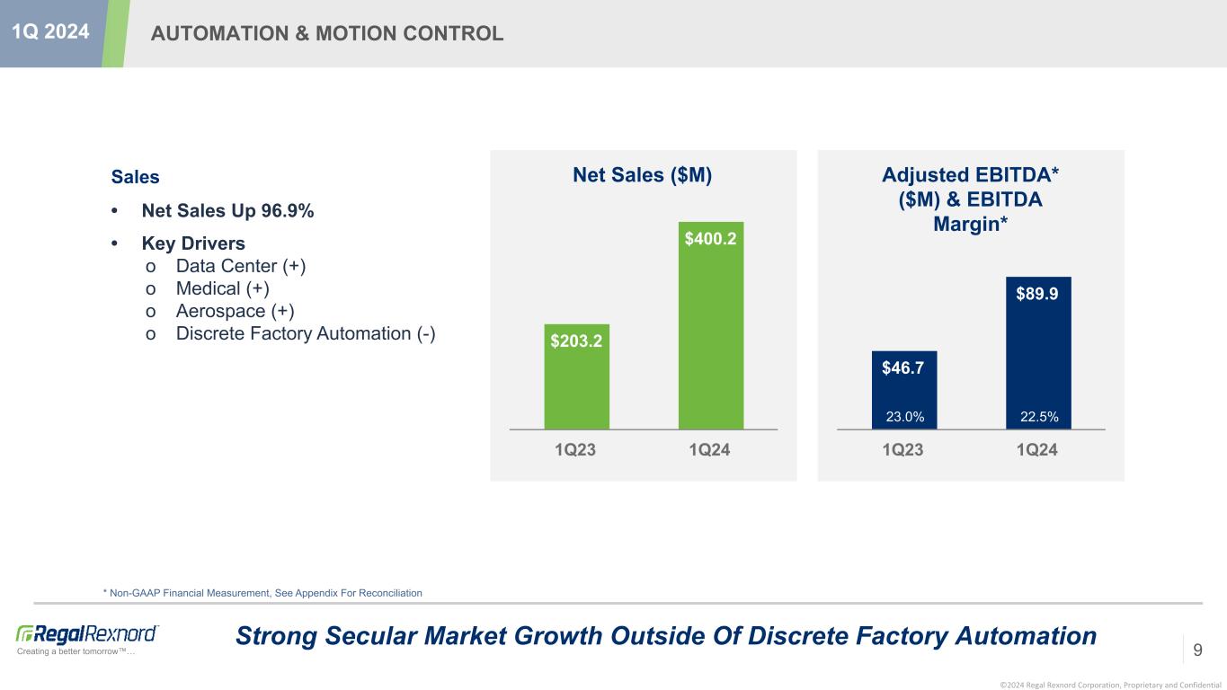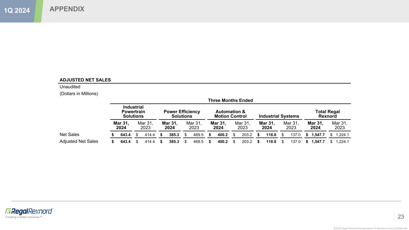 ©2024 Regal Rexnord Corporation, Proprietary and Confidential Creating a better tomorrow™… APPENDIX 23 1Q 2024 ADJUSTED NET SALES Unaudited (Dollars in Millions) Three Months Ended Industrial Powertrain Solutions Power Efficiency Solutions Automation & Motion Control Industrial Systems Total Regal Rexnord Mar 31, 2024 Mar 31, 2023 Mar 31, 2024 Mar 31, 2023 Mar 31, 2024 Mar 31, 2023 Mar 31, 2024 Mar 31, 2023 Mar 31, 2024 Mar 31, 2023 Net Sales $ 643.4 $ 414.4 $ 385.3 $ 469.5 $ 400.2 $ 203.2 $ 118.8 $ 137.0 $ 1,547.7 $ 1,224.1 Adjusted Net Sales $ 643.4 $ 414.4 $ 385.3 $ 469.5 $ 400.2 $ 203.2 $ 118.8 $ 137.0 $ 1,547.7 $ 1,224.1