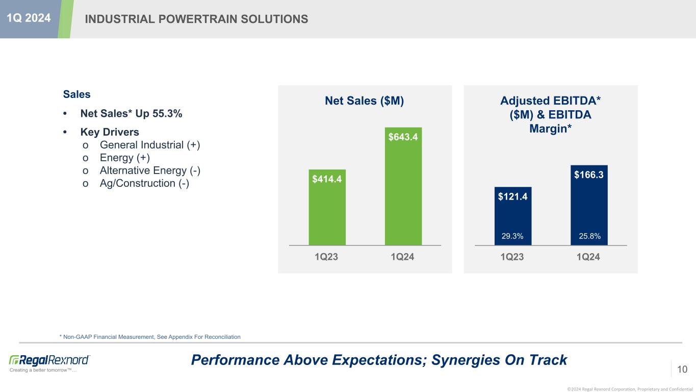 ©2024 Regal Rexnord Corporation, Proprietary and Confidential Creating a better tomorrow™… Sales • Net Sales Up 96.9% • Key Drivers o Data Center (+) o Medical (+) o Aerospace (+) o Discrete Factory Automation (-) AUTOMATION & MOTION CONTROL * Non-GAAP Financial Measurement, See Appendix For Reconciliation Strong Secular Market Growth Outside Of Discrete Factory Automation 9 1Q 2024 Net Sales ($M) $203.2 $400.2 1Q23 1Q24 Adjusted EBITDA* ($M) & EBITDA Margin* $46.7 $89.9 1Q23 1Q24 23.0% 22.5%