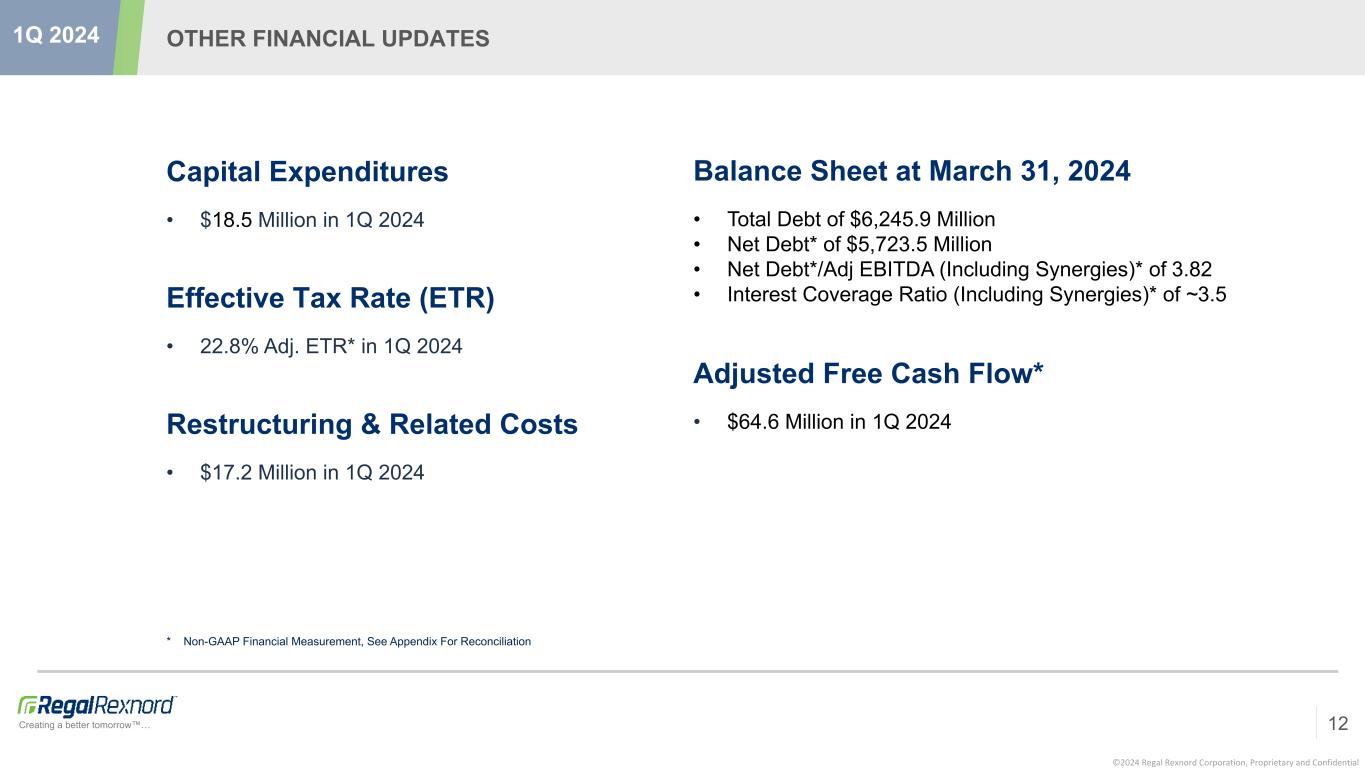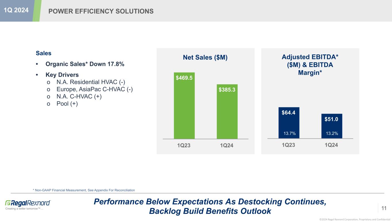 ©2024 Regal Rexnord Corporation, Proprietary and Confidential Creating a better tomorrow™… POWER EFFICIENCY SOLUTIONS * Non-GAAP Financial Measurement, See Appendix For Reconciliation Performance Below Expectations As Destocking Continues, Backlog Build Benefits Outlook Sales • Organic Sales* Down 17.8% • Key Drivers o N.A. Residential HVAC (-) o Europe, AsiaPac C-HVAC (-) o N.A. C-HVAC (+) o Pool (+) $21.3 $39.0 11 $189.8 1Q 2024 $135. 7 $165. 5 Net Sales ($M) $469.5 $385.3 1Q23 1Q24 Adjusted EBITDA* ($M) & EBITDA Margin* $64.4 $51.0 1Q23 1Q24 13.7% 13.2%