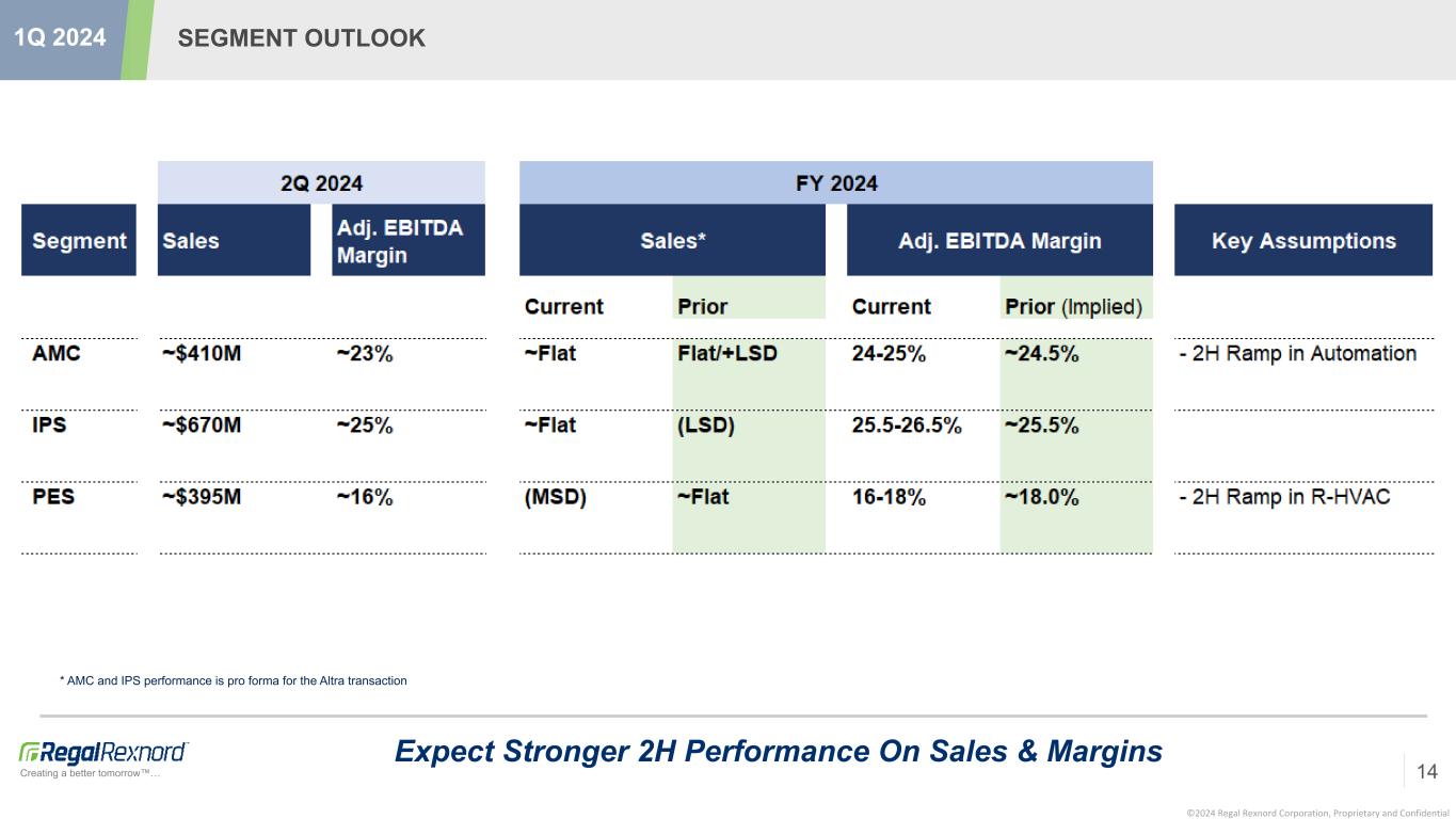 ©2024 Regal Rexnord Corporation, Proprietary and Confidential Creating a better tomorrow™… Adjusted EPS Outlook For 2024 Unchanged Excluding Industrial Sale Impacts 2024 OUTLOOK 13 1Q 2024 • Updating Outlook For Closing Sale Of Industrial Systems And Deploying Net Sale Proceeds To Debt Reduction, Worth ($0.15) Per Share • Making Modest Adjustments To Remaining Operations, Which Are Net Neutral To Adjusted Diluted EPS* • Now Expect 2024 Adjusted Diluted EPS* In A Range Of $9.60 - $10.40 (M/P $10.00) • Revenue For 2024 Now Expected To Be ~$6.25 Billion • Adjusted EBITDA Margin* For 2024 Now Expected To Be ~23% • Adjusted Free Cash Flow* Expected To Be $700 Million * Non-GAAP Financial Measurement, See Appendix For Reconciliation ** Net Of Interest Savings From Deploying Industrial Systems Sale Proceeds To Debt Reduction