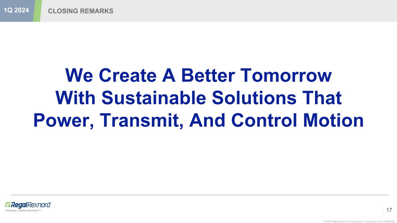 ©2024 Regal Rexnord Corporation, Proprietary and Confidential Creating a better tomorrow™… CLOSING REMARKS 17 1Q 2024 We Create A Better Tomorrow With Sustainable Solutions That Power, Transmit, And Control Motion
