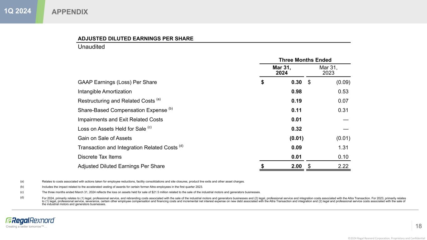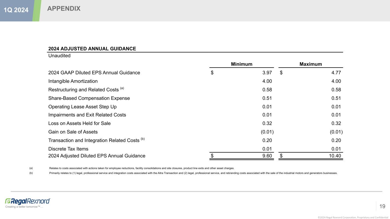 ©2024 Regal Rexnord Corporation, Proprietary and Confidential Creating a better tomorrow™… APPENDIX 18 1Q 2024 ADJUSTED DILUTED EARNINGS PER SHARE Unaudited Three Months Ended Mar 31, 2024 Mar 31, 2023 GAAP Earnings (Loss) Per Share $ 0.30 $ (0.09) Intangible Amortization 0.98 0.53 Restructuring and Related Costs (a) 0.19 0.07 Share-Based Compensation Expense (b) 0.11 0.31 Impairments and Exit Related Costs 0.01 — Loss on Assets Held for Sale (c) 0.32 — Gain on Sale of Assets (0.01) (0.01) Transaction and Integration Related Costs (d) 0.09 1.31 Discrete Tax Items 0.01 0.10 Adjusted Diluted Earnings Per Share $ 2.00 $ 2.22 (a) Relates to costs associated with actions taken for employee reductions, facility consolidations and site closures, product line exits and other asset charges. (b) Includes the impact related to the accelerated vesting of awards for certain former Altra employees in the first quarter 2023. (c) The three months ended March 31, 2024 reflects the loss on assets held for sale of $21.5 million related to the sale of the industrial motors and generators businesses. (d) For 2024, primarily relates to (1) legal, professional service, and rebranding costs associated with the sale of the industrial motors and generators businesses and (2) legal, professional service and integration costs associated with the Altra Transaction. For 2023, primarily relates to (1) legal, professional service, severance, certain other employee compensation and financing costs and incremental net interest expense on new debt associated with the Altra Transaction and integration and (2) legal and professional service costs associated with the sale of the industrial motors and generators businesses.