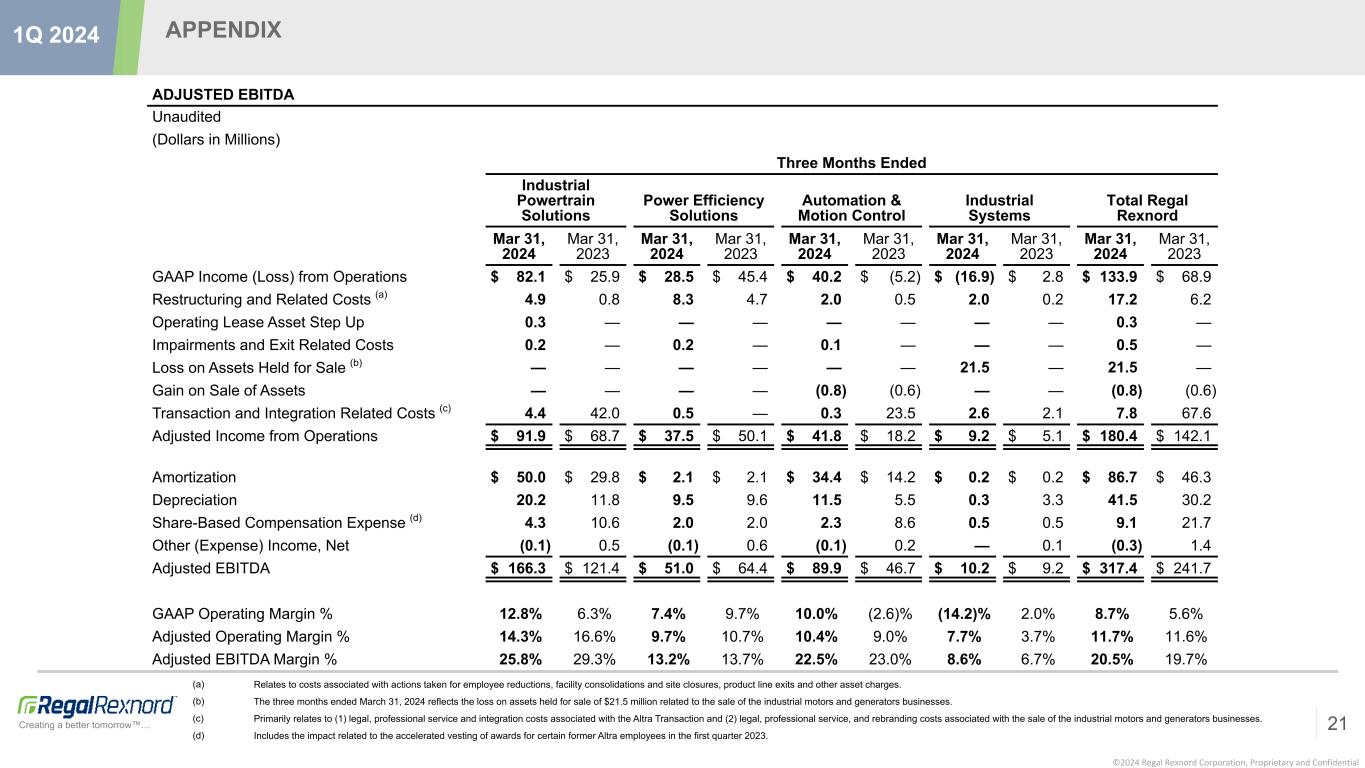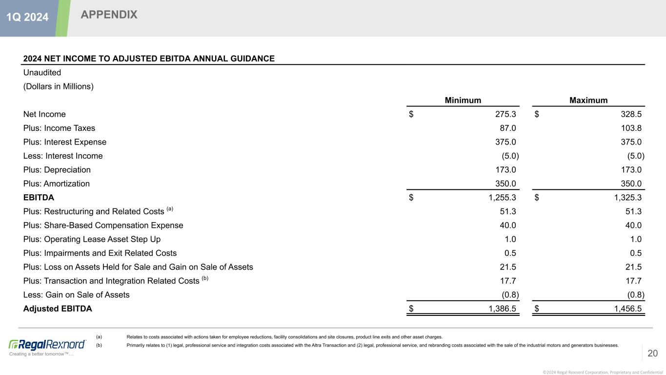 ©2024 Regal Rexnord Corporation, Proprietary and Confidential Creating a better tomorrow™… APPENDIX 20 1Q 2024 2024 NET INCOME TO ADJUSTED EBITDA ANNUAL GUIDANCE Unaudited (Dollars in Millions) Minimum Maximum Net Income $ 275.3 $ 328.5 Plus: Income Taxes 87.0 103.8 Plus: Interest Expense 375.0 375.0 Less: Interest Income (5.0) (5.0) Plus: Depreciation 173.0 173.0 Plus: Amortization 350.0 350.0 EBITDA $ 1,255.3 $ 1,325.3 Plus: Restructuring and Related Costs (a) 51.3 51.3 Plus: Share-Based Compensation Expense 40.0 40.0 Plus: Operating Lease Asset Step Up 1.0 1.0 Plus: Impairments and Exit Related Costs 0.5 0.5 Plus: Loss on Assets Held for Sale and Gain on Sale of Assets 21.5 21.5 Plus: Transaction and Integration Related Costs (b) 17.7 17.7 Less: Gain on Sale of Assets (0.8) (0.8) Adjusted EBITDA $ 1,386.5 $ 1,456.5 (a) Relates to costs associated with actions taken for employee reductions, facility consolidations and site closures, product line exits and other asset charges. (b) Primarily relates to (1) legal, professional service and integration costs associated with the Altra Transaction and (2) legal, professional service, and rebranding costs associated with the sale of the industrial motors and generators businesses.