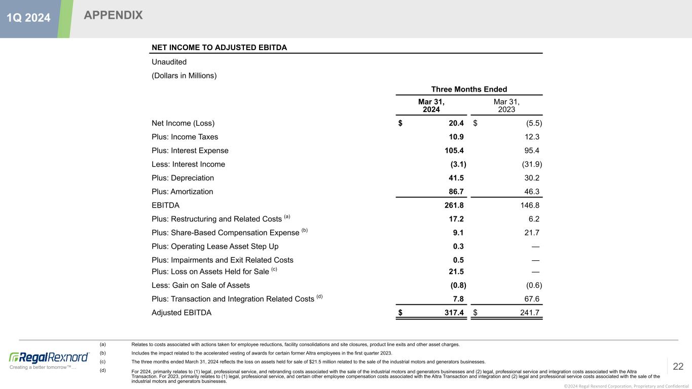 ©2024 Regal Rexnord Corporation, Proprietary and Confidential Creating a better tomorrow™… APPENDIX 22 1Q 2024 NET INCOME TO ADJUSTED EBITDA Unaudited (Dollars in Millions) Three Months Ended Mar 31, 2024 Mar 31, 2023 Net Income (Loss) $ 20.4 $ (5.5) Plus: Income Taxes 10.9 12.3 Plus: Interest Expense 105.4 95.4 Less: Interest Income (3.1) (31.9) Plus: Depreciation 41.5 30.2 Plus: Amortization 86.7 46.3 EBITDA 261.8 146.8 Plus: Restructuring and Related Costs (a) 17.2 6.2 Plus: Share-Based Compensation Expense (b) 9.1 21.7 Plus: Operating Lease Asset Step Up 0.3 — Plus: Impairments and Exit Related Costs 0.5 — Plus: Loss on Assets Held for Sale (c) 21.5 — Less: Gain on Sale of Assets (0.8) (0.6) Plus: Transaction and Integration Related Costs (d) 7.8 67.6 Adjusted EBITDA $ 317.4 $ 241.7 (a) Relates to costs associated with actions taken for employee reductions, facility consolidations and site closures, product line exits and other asset charges. (b) Includes the impact related to the accelerated vesting of awards for certain former Altra employees in the first quarter 2023. (c) The three months ended March 31, 2024 reflects the loss on assets held for sale of $21.5 million related to the sale of the industrial motors and generators businesses. (d) For 2024, primarily relates to (1) legal, professional service, and rebranding costs associated with the sale of the industrial motors and generators businesses and (2) legal, professional service and integration costs associated with the Altra Transaction. For 2023, primarily relates to (1) legal, professional service, and certain other employee compensation costs associated with the Altra Transaction and integration and (2) legal and professional service costs associated with the sale of the industrial motors and generators businesses.
