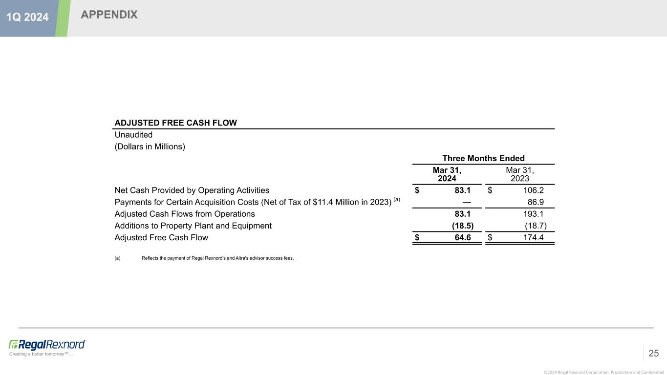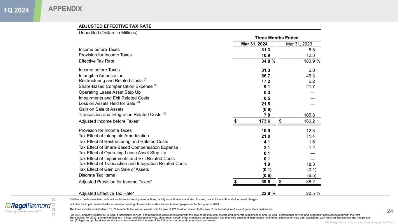 ©2024 Regal Rexnord Corporation, Proprietary and Confidential Creating a better tomorrow™… APPENDIX 24 1Q 2024 ADJUSTED EFFECTIVE TAX RATE Unaudited (Dollars in Millions) Three Months Ended Mar 31, 2024 Mar 31, 2023 Income before Taxes 31.3 6.8 Provision for Income Taxes 10.9 12.3 Effective Tax Rate 34.8 % 180.9 % Income before Taxes 31.3 6.8 Intangible Amortization 86.7 46.3 Restructuring and Related Costs (a) 17.2 6.2 Share-Based Compensation Expense (b) 9.1 21.7 Operating Lease Asset Step Up 0.3 — Impairments and Exit Related Costs 0.5 — Loss on Assets Held for Sale (c) 21.5 — Gain on Sale of Assets (0.8) — Transaction and Integration Related Costs (d) 7.8 105.8 Adjusted Income before Taxes* $ 173.6 $ 186.2 Provision for Income Taxes 10.9 12.3 Tax Effect of Intangible Amortization 21.0 11.4 Tax Effect of Restructuring and Related Costs 4.1 1.6 Tax Effect of Share-Based Compensation Expense 2.1 1.2 Tax Effect of Operating Lease Asset Step Up 0.1 — Tax Effect of Impairments and Exit Related Costs 0.1 — Tax Effect of Transaction and Integration Related Costs 1.9 18.3 Tax Effect of Gain on Sale of Assets (0.1) (0.1) Discrete Tax Items (0.6) (6.5) Adjusted Provision for Income Taxes* $ 39.5 $ 38.2 Adjusted Effective Tax Rate* 22.8 % 20.5 % (a) Relates to costs associated with actions taken for employee reductions, facility consolidations and site closures, product line exits and other asset charges. (b) Includes the impact related to the accelerated vesting of awards for certain former Altra employees in the first quarter 2023. (c) The three months ended March 31, 2024 reflects the loss on assets held for sale of $21.5 million related to the sale of the industrial motors and generators businesses. (d) For 2024, primarily relates to (1) legal, professional service, and rebranding costs associated with the sale of the industrial motors and generators businesses and (2) legal, professional service and integration costs associated with the Altra Transaction. For 2023, primarily relates to (1) legal, professional service, severance, certain other employee compensation and financing costs and incremental net interest expense on new debt associated with the Altra Transaction and integration and (2) legal and professional service costs associated with the sale of the industrial motors and generators businesses.