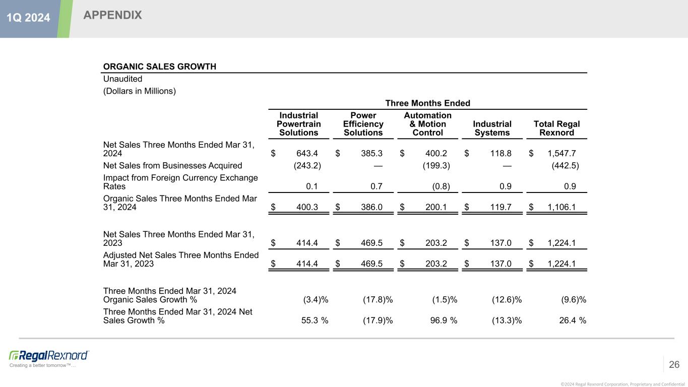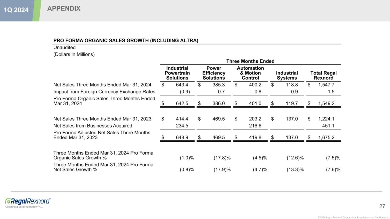©2024 Regal Rexnord Corporation, Proprietary and Confidential Creating a better tomorrow™… APPENDIX 26 1Q 2024 ORGANIC SALES GROWTH Unaudited (Dollars in Millions) Three Months Ended Industrial Powertrain Solutions Power Efficiency Solutions Automation & Motion Control Industrial Systems Total Regal Rexnord Net Sales Three Months Ended Mar 31, 2024 $ 643.4 $ 385.3 $ 400.2 $ 118.8 $ 1,547.7 Net Sales from Businesses Acquired (243.2) — (199.3) — (442.5) Impact from Foreign Currency Exchange Rates 0.1 0.7 (0.8) 0.9 0.9 Organic Sales Three Months Ended Mar 31, 2024 $ 400.3 $ 386.0 $ 200.1 $ 119.7 $ 1,106.1 Net Sales Three Months Ended Mar 31, 2023 $ 414.4 $ 469.5 $ 203.2 $ 137.0 $ 1,224.1 Adjusted Net Sales Three Months Ended Mar 31, 2023 $ 414.4 $ 469.5 $ 203.2 $ 137.0 $ 1,224.1 Three Months Ended Mar 31, 2024 Organic Sales Growth % (3.4) % (17.8) % (1.5) % (12.6) % (9.6) % Three Months Ended Mar 31, 2024 Net Sales Growth % 55.3 % (17.9) % 96.9 % (13.3) % 26.4 %