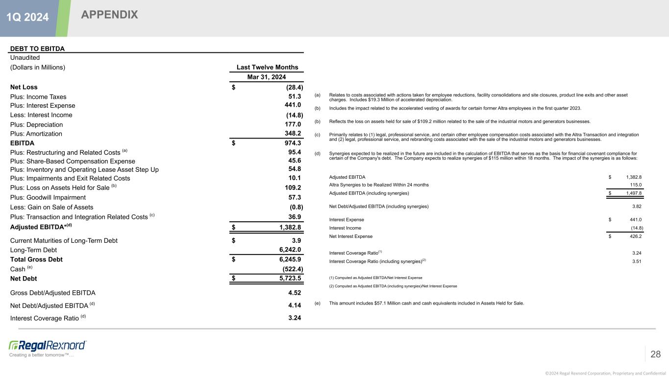 ©2024 Regal Rexnord Corporation, Proprietary and Confidential Creating a better tomorrow™… APPENDIX 28 1Q 2024 DEBT TO EBITDA Unaudited (Dollars in Millions) Last Twelve Months Mar 31, 2024 Net Loss $ (28.4) Plus: Income Taxes 51.3 Plus: Interest Expense 441.0 Less: Interest Income (14.8) Plus: Depreciation 177.0 Plus: Amortization 348.2 EBITDA $ 974.3 Plus: Restructuring and Related Costs (a) 95.4 Plus: Share-Based Compensation Expense 45.6 Plus: Inventory and Operating Lease Asset Step Up 54.8 Plus: Impairments and Exit Related Costs 10.1 Plus: Loss on Assets Held for Sale (b) 109.2 Plus: Goodwill Impairment 57.3 Less: Gain on Sale of Assets (0.8) Plus: Transaction and Integration Related Costs (c) 36.9 Adjusted EBITDA*(d) $ 1,382.8 Current Maturities of Long-Term Debt $ 3.9 Long-Term Debt 6,242.0 Total Gross Debt $ 6,245.9 Cash (e) (522.4) Net Debt $ 5,723.5 Gross Debt/Adjusted EBITDA 4.52 Net Debt/Adjusted EBITDA (d) 4.14 Interest Coverage Ratio (d) 3.24 (a) Relates to costs associated with actions taken for employee reductions, facility consolidations and site closures, product line exits and other asset charges. Includes $19.3 Million of accelerated depreciation. (b) Includes the impact related to the accelerated vesting of awards for certain former Altra employees in the first quarter 2023. (b) Reflects the loss on assets held for sale of $109.2 million related to the sale of the industrial motors and generators businesses. (c) Primarily relates to (1) legal, professional service, and certain other employee compensation costs associated with the Altra Transaction and integration and (2) legal, professional service, and rebranding costs associated with the sale of the industrial motors and generators businesses. (d) Synergies expected to be realized in the future are included in the calculation of EBITDA that serves as the basis for financial covenant compliance for certain of the Company's debt. The Company expects to realize synergies of $115 million within 18 months. The impact of the synergies is as follows: Adjusted EBITDA $ 1,382.8 Altra Synergies to be Realized Within 24 months 115.0 Adjusted EBITDA (including synergies) $ 1,497.8 Net Debt/Adjusted EBITDA (including synergies) 3.82 Interest Expense $ 441.0 Interest Income (14.8) Net Interest Expense $ 426.2 Interest Coverage Ratio(1) 3.24 Interest Coverage Ratio (including synergies)(2) 3.51 (1) Computed as Adjusted EBITDA/Net Interest Expense (2) Computed as Adjusted EBITDA (including synergies)/Net Interest Expense (e) This amount includes $57.1 Million cash and cash equivalents included in Assets Held for Sale.