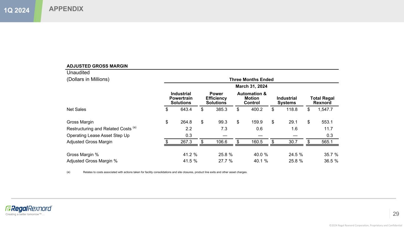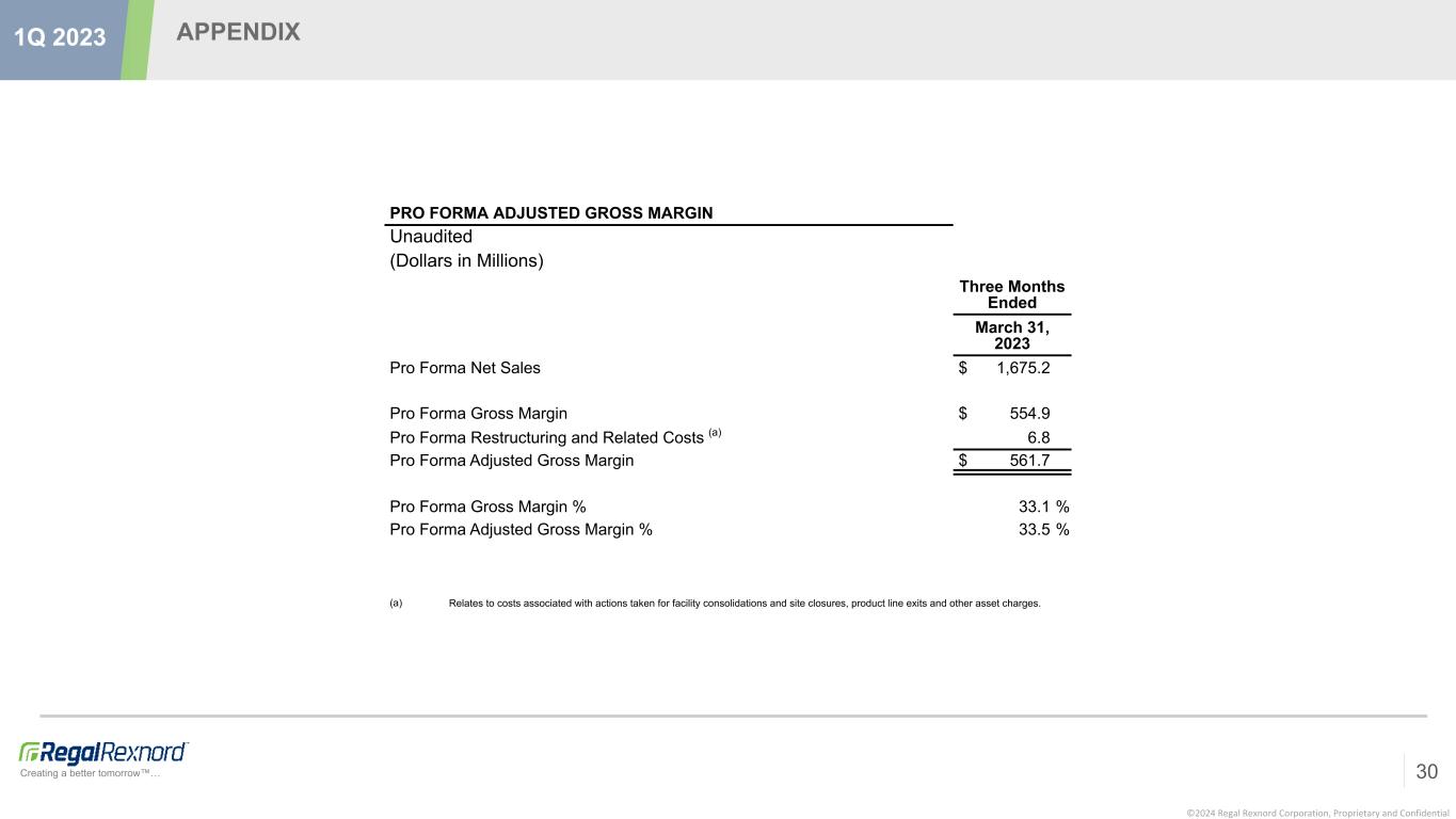 ©2024 Regal Rexnord Corporation, Proprietary and Confidential Creating a better tomorrow™… APPENDIX 29 1Q 2024 ADJUSTED GROSS MARGIN Unaudited (Dollars in Millions) Three Months Ended March 31, 2024 Industrial Powertrain Solutions Power Efficiency Solutions Automation & Motion Control Industrial Systems Total Regal Rexnord Net Sales $ 643.4 $ 385.3 $ 400.2 $ 118.8 $ 1,547.7 Gross Margin $ 264.8 $ 99.3 $ 159.9 $ 29.1 $ 553.1 Restructuring and Related Costs (a) 2.2 7.3 0.6 1.6 11.7 Operating Lease Asset Step Up 0.3 — — — 0.3 Adjusted Gross Margin $ 267.3 $ 106.6 $ 160.5 $ 30.7 $ 565.1 Gross Margin % 41.2 % 25.8 % 40.0 % 24.5 % 35.7 % Adjusted Gross Margin % 41.5 % 27.7 % 40.1 % 25.8 % 36.5 % (a) Relates to costs associated with actions taken for facility consolidations and site closures, product line exits and other asset charges.
