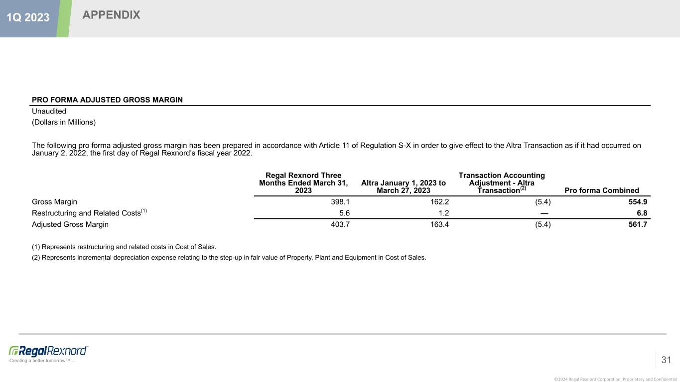 ©2024 Regal Rexnord Corporation, Proprietary and Confidential Creating a better tomorrow™… APPENDIX 30 1Q 2023 PRO FORMA ADJUSTED GROSS MARGIN Unaudited (Dollars in Millions) Three Months Ended March 31, 2023 Pro Forma Net Sales $ 1,675.2 Pro Forma Gross Margin $ 554.9 Pro Forma Restructuring and Related Costs (a) 6.8 Pro Forma Adjusted Gross Margin $ 561.7 Pro Forma Gross Margin % 33.1 % Pro Forma Adjusted Gross Margin % 33.5 % (a) Relates to costs associated with actions taken for facility consolidations and site closures, product line exits and other asset charges.