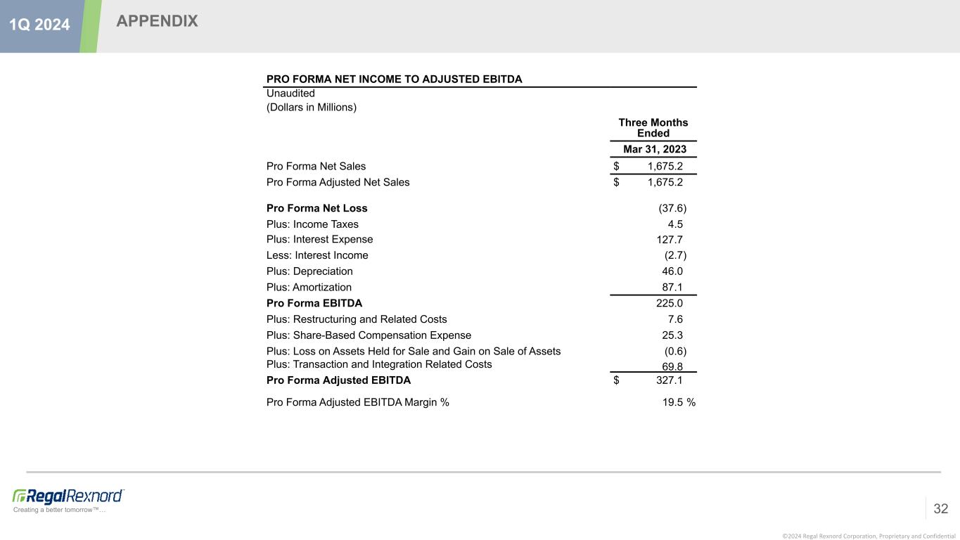 ©2024 Regal Rexnord Corporation, Proprietary and Confidential Creating a better tomorrow™… APPENDIX 32 1Q 2024 PRO FORMA NET INCOME TO ADJUSTED EBITDA Unaudited (Dollars in Millions) Three Months Ended Mar 31, 2023 Pro Forma Net Sales $ 1,675.2 Pro Forma Adjusted Net Sales $ 1,675.2 Pro Forma Net Loss (37.6) Plus: Income Taxes 4.5 Plus: Interest Expense 127.7 Less: Interest Income (2.7) Plus: Depreciation 46.0 Plus: Amortization 87.1 Pro Forma EBITDA 225.0 Plus: Restructuring and Related Costs 7.6 Plus: Share-Based Compensation Expense 25.3 Plus: Loss on Assets Held for Sale and Gain on Sale of Assets (0.6) Plus: Transaction and Integration Related Costs 69.8 Pro Forma Adjusted EBITDA $ 327.1 Pro Forma Adjusted EBITDA Margin % 19.5 %