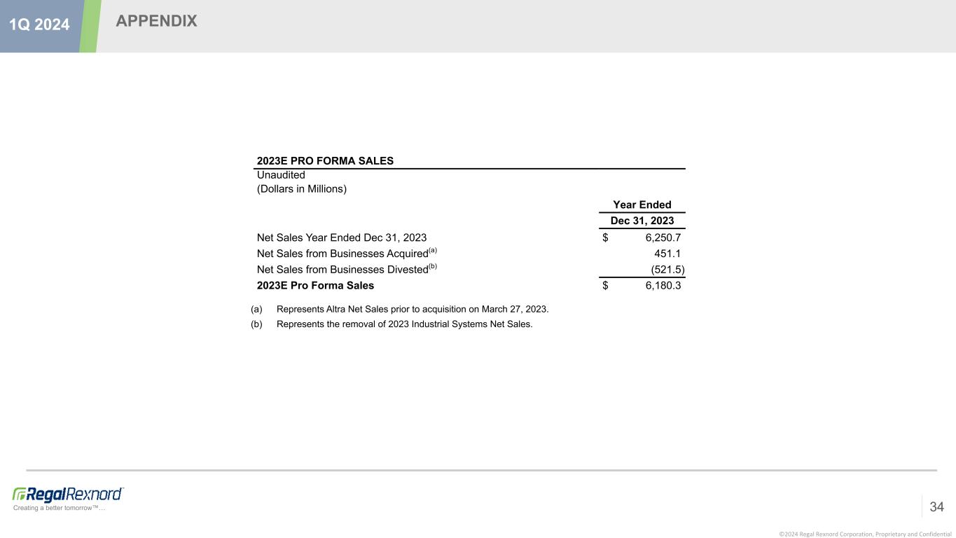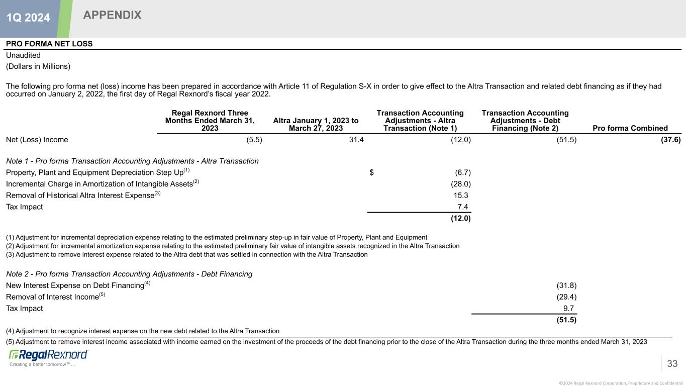 ©2024 Regal Rexnord Corporation, Proprietary and Confidential Creating a better tomorrow™… APPENDIX 33 1Q 2024 PRO FORMA NET LOSS Unaudited (Dollars in Millions) The following pro forma net (loss) income has been prepared in accordance with Article 11 of Regulation S-X in order to give effect to the Altra Transaction and related debt financing as if they had occurred on January 2, 2022, the first day of Regal Rexnord’s fiscal year 2022. Regal Rexnord Three Months Ended March 31, 2023 Altra January 1, 2023 to March 27, 2023 Transaction Accounting Adjustments - Altra Transaction (Note 1) Transaction Accounting Adjustments - Debt Financing (Note 2) Pro forma Combined Net (Loss) Income (5.5) 31.4 (12.0) (51.5) (37.6) Note 1 - Pro forma Transaction Accounting Adjustments - Altra Transaction Property, Plant and Equipment Depreciation Step Up(1) $ (6.7) Incremental Charge in Amortization of Intangible Assets(2) (28.0) Removal of Historical Altra Interest Expense(3) 15.3 Tax Impact 7.4 (12.0) (1) Adjustment for incremental depreciation expense relating to the estimated preliminary step-up in fair value of Property, Plant and Equipment (2) Adjustment for incremental amortization expense relating to the estimated preliminary fair value of intangible assets recognized in the Altra Transaction (3) Adjustment to remove interest expense related to the Altra debt that was settled in connection with the Altra Transaction Note 2 - Pro forma Transaction Accounting Adjustments - Debt Financing New Interest Expense on Debt Financing(4) (31.8) Removal of Interest Income(5) (29.4) Tax Impact 9.7 (51.5) (4) Adjustment to recognize interest expense on the new debt related to the Altra Transaction (5) Adjustment to remove interest income associated with income earned on the investment of the proceeds of the debt financing prior to the close of the Altra Transaction during the three months ended March 31, 2023
