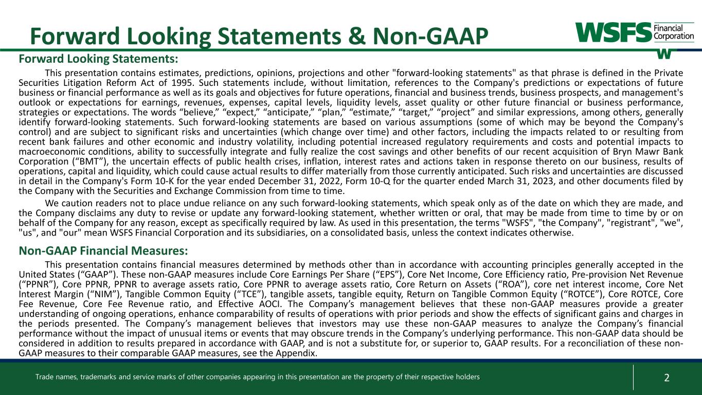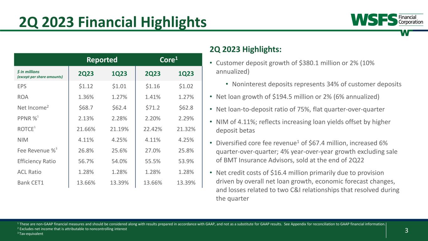2 Forward Looking Statements & Non-GAAP Forward Looking Statements: This presentation contains estimates, predictions, opinions, projections and other "forward-looking statements" as that phrase is defined in the Private Securities Litigation Reform Act of 1995. Such statements include, without limitation, references to the Company's predictions or expectations of future business or financial performance as well as its goals and objectives for future operations, financial and business trends, business prospects, and management's outlook or expectations for earnings, revenues, expenses, capital levels, liquidity levels, asset quality or other future financial or business performance, strategies or expectations. The words “believe,” “expect,” “anticipate,” “plan,” “estimate,” “target,” “project” and similar expressions, among others, generally identify forward-looking statements. Such forward-looking statements are based on various assumptions (some of which may be beyond the Company's control) and are subject to significant risks and uncertainties (which change over time) and other factors, including the impacts related to or resulting from recent bank failures and other economic and industry volatility, including potential increased regulatory requirements and costs and potential impacts to macroeconomic conditions, ability to successfully integrate and fully realize the cost savings and other benefits of our recent acquisition of Bryn Mawr Bank Corporation (“BMT”), the uncertain effects of public health crises, inflation, interest rates and actions taken in response thereto on our business, results of operations, capital and liquidity, which could cause actual results to differ materially from those currently anticipated. Such risks and uncertainties are discussed in detail in the Company's Form 10-K for the year ended December 31, 2022, Form 10-Q for the quarter ended March 31, 2023, and other documents filed by the Company with the Securities and Exchange Commission from time to time. We caution readers not to place undue reliance on any such forward-looking statements, which speak only as of the date on which they are made, and the Company disclaims any duty to revise or update any forward-looking statement, whether written or oral, that may be made from time to time by or on behalf of the Company for any reason, except as specifically required by law. As used in this presentation, the terms "WSFS", "the Company", "registrant", "we", "us", and "our" mean WSFS Financial Corporation and its subsidiaries, on a consolidated basis, unless the context indicates otherwise. Non-GAAP Financial Measures: This presentation contains financial measures determined by methods other than in accordance with accounting principles generally accepted in the United States (“GAAP”). These non-GAAP measures include Core Earnings Per Share (“EPS”), Core Net Income, Core Efficiency ratio, Pre-provision Net Revenue (“PPNR”), Core PPNR, PPNR to average assets ratio, Core PPNR to average assets ratio, Core Return on Assets (“ROA”), core net interest income, Core Net Interest Margin (“NIM”), Tangible Common Equity (“TCE”), tangible assets, tangible equity, Return on Tangible Common Equity (“ROTCE”), Core ROTCE, Core Fee Revenue, Core Fee Revenue ratio, and Effective AOCI. The Company’s management believes that these non-GAAP measures provide a greater understanding of ongoing operations, enhance comparability of results of operations with prior periods and show the effects of significant gains and charges in the periods presented. The Company’s management believes that investors may use these non-GAAP measures to analyze the Company’s financial performance without the impact of unusual items or events that may obscure trends in the Company’s underlying performance. This non-GAAP data should be considered in addition to results prepared in accordance with GAAP, and is not a substitute for, or superior to, GAAP results. For a reconciliation of these non- GAAP measures to their comparable GAAP measures, see the Appendix. Trade names, trademarks and service marks of other companies appearing in this presentation are the property of their respective holders.