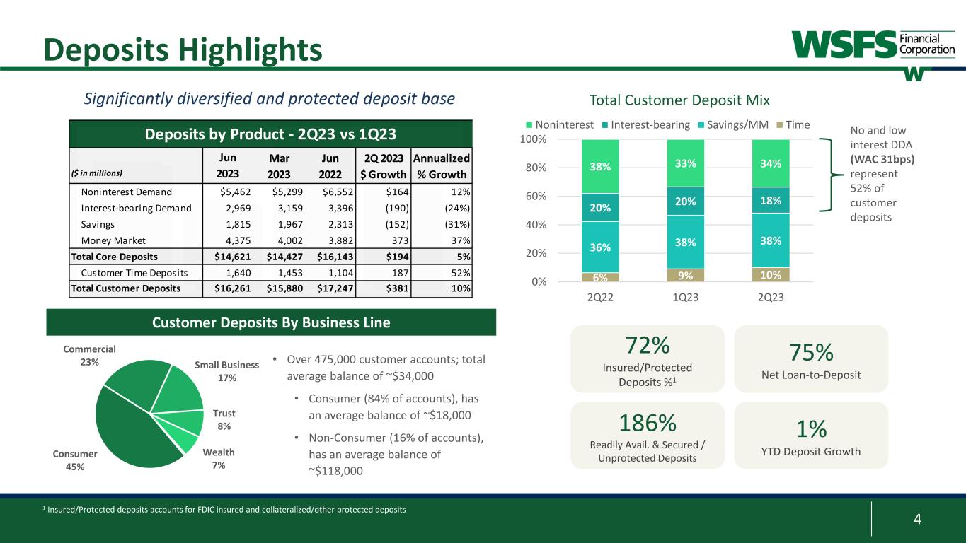 3 2Q 2023 Financial Highlights 2Q 2023 Highlights: • Customer deposit growth of $380.1 million or 2% (10% annualized) • Noninterest deposits represents 34% of customer deposits • Net loan growth of $194.5 million or 2% (6% annualized) • Net loan-to-deposit ratio of 75%, flat quarter-over-quarter • NIM of 4.11%; reflects increasing loan yields offset by higher deposit betas • Diversified core fee revenue1 of $67.4 million, increased 6% quarter-over-quarter; 4% year-over-year growth excluding sale of BMT Insurance Advisors, sold at the end of 2Q22 • Net credit costs of $16.4 million primarily due to provision driven by overall net loan growth, economic forecast changes, and losses related to two C&I relationships that resolved during the quarter 1 These are non-GAAP financial measures and should be considered along with results prepared in accordance with GAAP, and not as a substitute for GAAP results. See Appendix for reconciliation to GAAP financial information. 2 Excludes net income that is attributable to noncontrolling interest 3 Tax-equivalent Reported Core1 $ in millions (except per share amounts) 2Q23 1Q23 2Q23 1Q23 EPS $1.12 $1.01 $1.16 $1.02 ROA 1.36% 1.27% 1.41% 1.27% Net Income2 $68.7 $62.4 $71.2 $62.8 PPNR %1 2.13% 2.28% 2.20% 2.29% ROTCE1 21.66% 21.19% 22.42% 21.32% NIM 4.11% 4.25% 4.11% 4.25% Fee Revenue %3 26.8% 25.6% 27.0% 25.8% Efficiency Ratio 56.7% 54.0% 55.5% 53.9% ACL Ratio 1.28% 1.28% 1.28% 1.28% Bank CET1 13.66% 13.39% 13.66% 13.39%