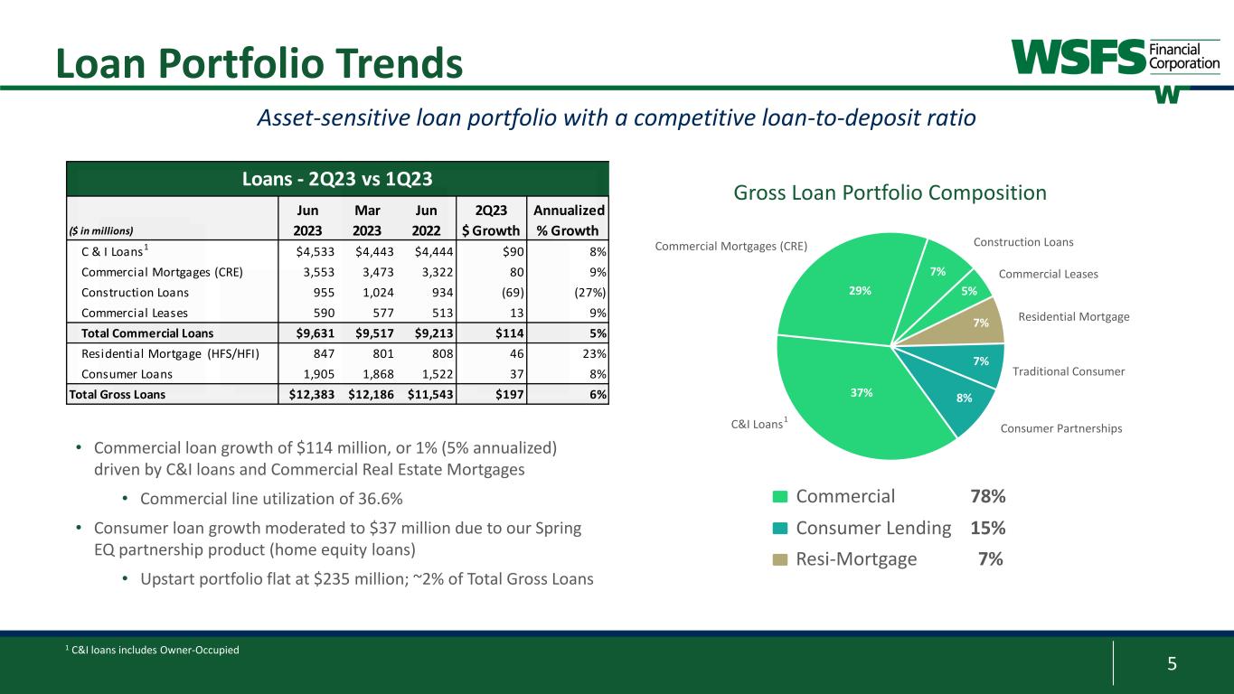 4 1 Insured/Protected deposits accounts for FDIC insured and collateralized/other protected deposits Deposits Highlights Significantly diversified and protected deposit base Consumer 45% Commercial 23% Small Business 17% Trust 8% Wealth 7% Customer Deposits By Business Line 75% Net Loan-to-Deposit 72% Insured/Protected Deposits %1 186% Readily Avail. & Secured / Unprotected Deposits 1% YTD Deposit Growth Total Customer Deposit Mix 6% 9% 10% 36% 38% 38% 20% 20% 18% 38% 33% 34% 0% 20% 40% 60% 80% 100% 2Q22 1Q23 2Q23 Noninterest Interest-bearing Savings/MM Time No and low interest DDA (WAC 31bps) represent 52% of customer deposits ($ in millions) Mar 2023 Jun 2022 2Q 2023 $ Growth Annualized % Growth Noninterest Demand $5,462 $5,299 $6,552 $164 12% Interest-bearing Demand 2,969 3,159 3,396 (190) (24%) Savings 1,815 1,967 2,313 (152) (31%) Money Market 4,375 4,002 3,882 373 37% Total Core Deposits $14,621 $14,427 $16,143 $194 5% Customer Time Deposits 1,640 1,453 1,104 187 52% Total Customer Deposits $16,261 $15,880 $17,247 $381 10% Deposits by Product - 2Q23 vs 1Q23 Jun 2023 • Over 475,000 customer accounts; total average balance of ~$34,000 • Consumer (84% of accounts), has an average balance of ~$18,000 • Non-Consumer (16% of accounts), has an average balance of ~$118,000