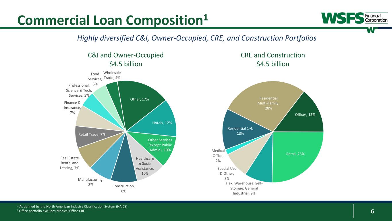 5 Loan Portfolio Trends • Commercial loan growth of $114 million, or 1% (5% annualized) driven by C&I loans and Commercial Real Estate Mortgages • Commercial line utilization of 36.6% • Consumer loan growth moderated to $37 million due to our Spring EQ partnership product (home equity loans) • Upstart portfolio flat at $235 million; ~2% of Total Gross Loans Asset-sensitive loan portfolio with a competitive loan-to-deposit ratio Gross Loan Portfolio Composition 1 C&I loans includes Owner-Occupied C&I Loans Commercial Mortgages (CRE) Construction Loans Commercial Leases Residential Mortgage Traditional Consumer Consumer Partnerships 29% 37% 7% 5% 7% 7% 8% Commercial 78% Resi-Mortgage 7% Consumer Lending 15% ($ in millions) Jun 2023 Mar 2023 Jun 2022 2Q23 $ Growth Annualized % Growth C & I Loans1 $4,533 $4,443 $4,444 $90 8% Commercial Mortgages (CRE) 3,553 3,473 3,322 80 9% Construction Loans 955 1,024 934 (69) (27%) Commercial Leases 590 577 513 13 9% Total Commercial Loans $9,631 $9,517 $9,213 $114 5% Residential Mortgage (HFS/HFI) 847 801 808 46 23% Consumer Loans 1,905 1,868 1,522 37 8% Total Gross Loans $12,383 $12,186 $11,543 $197 6% Loans - 2Q23 vs 1Q23 1