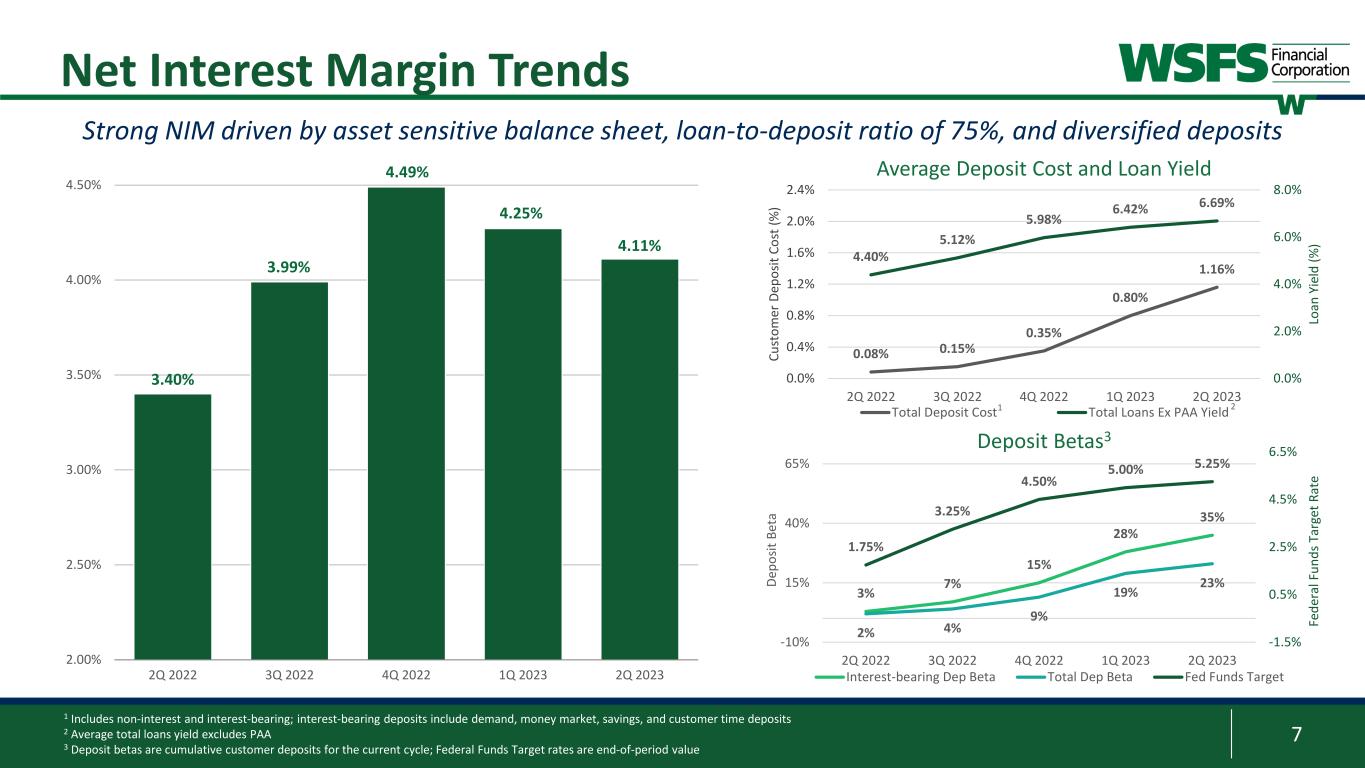 6 3 Commercial Loan Composition1 1 As defined by the North American Industry Classification System (NAICS) 2 Office portfolio excludes Medical Office CRE Highly diversified C&I, Owner-Occupied, CRE, and Construction Portfolios 2 Flex, Warehouse, Self- Storage, General Industrial, 9% Special Use & Other, 8% Medical Office, 2% Residential 1-4, 13% Residential Multi-Family, 28% Office2, 15% Retail, 25% Hotels, 12% Other Services (except Public Admin), 10% Healthcare & Social Assistance, 10% Construction, 8% Manufacturing, 8% Retail Trade, 7% Finance & Insurance, 7% Professional, Science & Tech. Services, 5% Food Services, 5% Wholesale Trade, 4% Other, 17% C&I and Owner-Occupied $4.5 billion CRE and Construction $4.5 billion Real Estate Rental and Leasing, 7%
