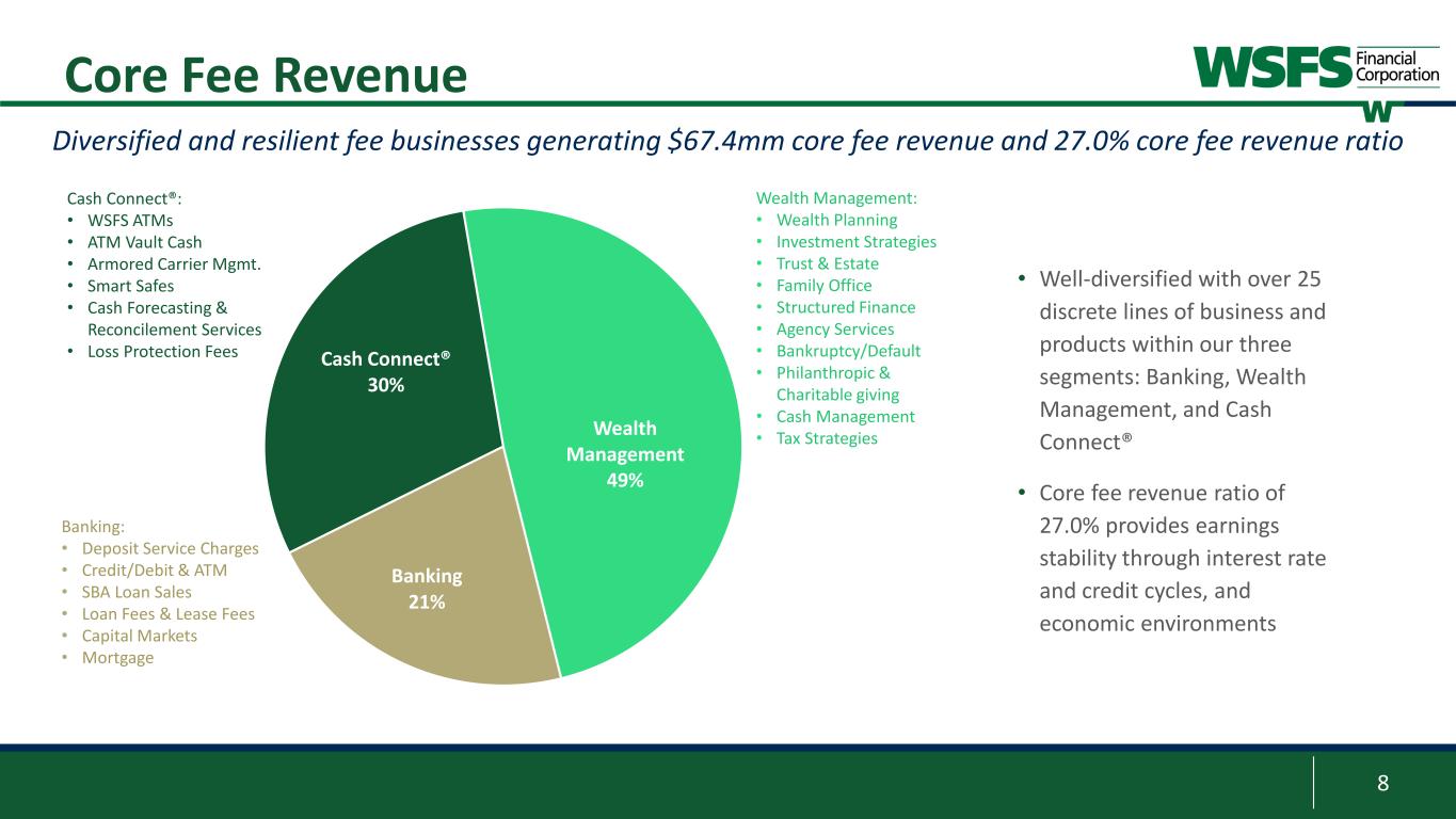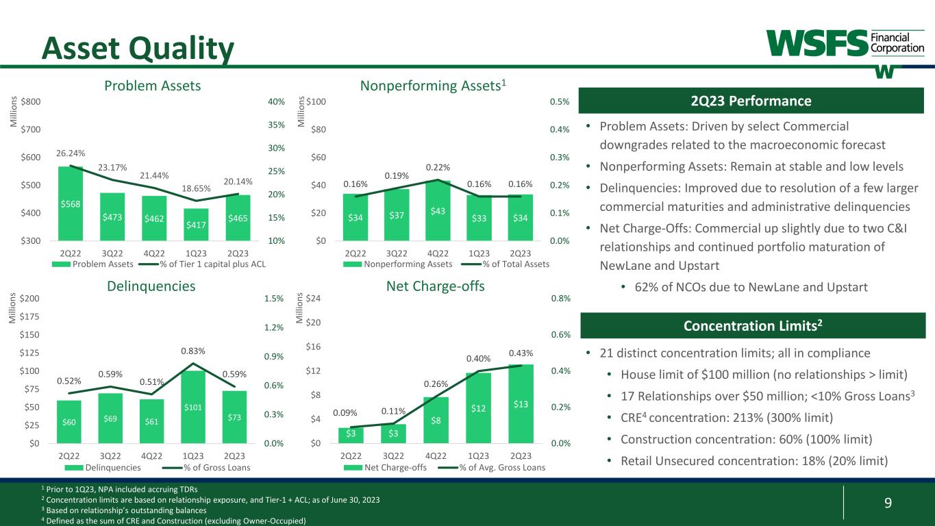 8 Banking 21% Cash Connect® 30% Wealth Management 49% • Well-diversified with over 25 discrete lines of business and products within our three segments: Banking, Wealth Management, and Cash Connect® • Core fee revenue ratio of 27.0% provides earnings stability through interest rate and credit cycles, and economic environments Core Fee Revenue Diversified and resilient fee businesses generating $67.4mm core fee revenue and 27.0% core fee revenue ratio Wealth Management: • Wealth Planning • Investment Strategies • Trust & Estate • Family Office • Structured Finance • Agency Services • Bankruptcy/Default • Philanthropic & Charitable giving • Cash Management • Tax Strategies Banking: • Deposit Service Charges • Credit/Debit & ATM • SBA Loan Sales • Loan Fees & Lease Fees • Capital Markets • Mortgage Cash Connect®: • WSFS ATMs • ATM Vault Cash • Armored Carrier Mgmt. • Smart Safes • Cash Forecasting & Reconcilement Services • Loss Protection Fees