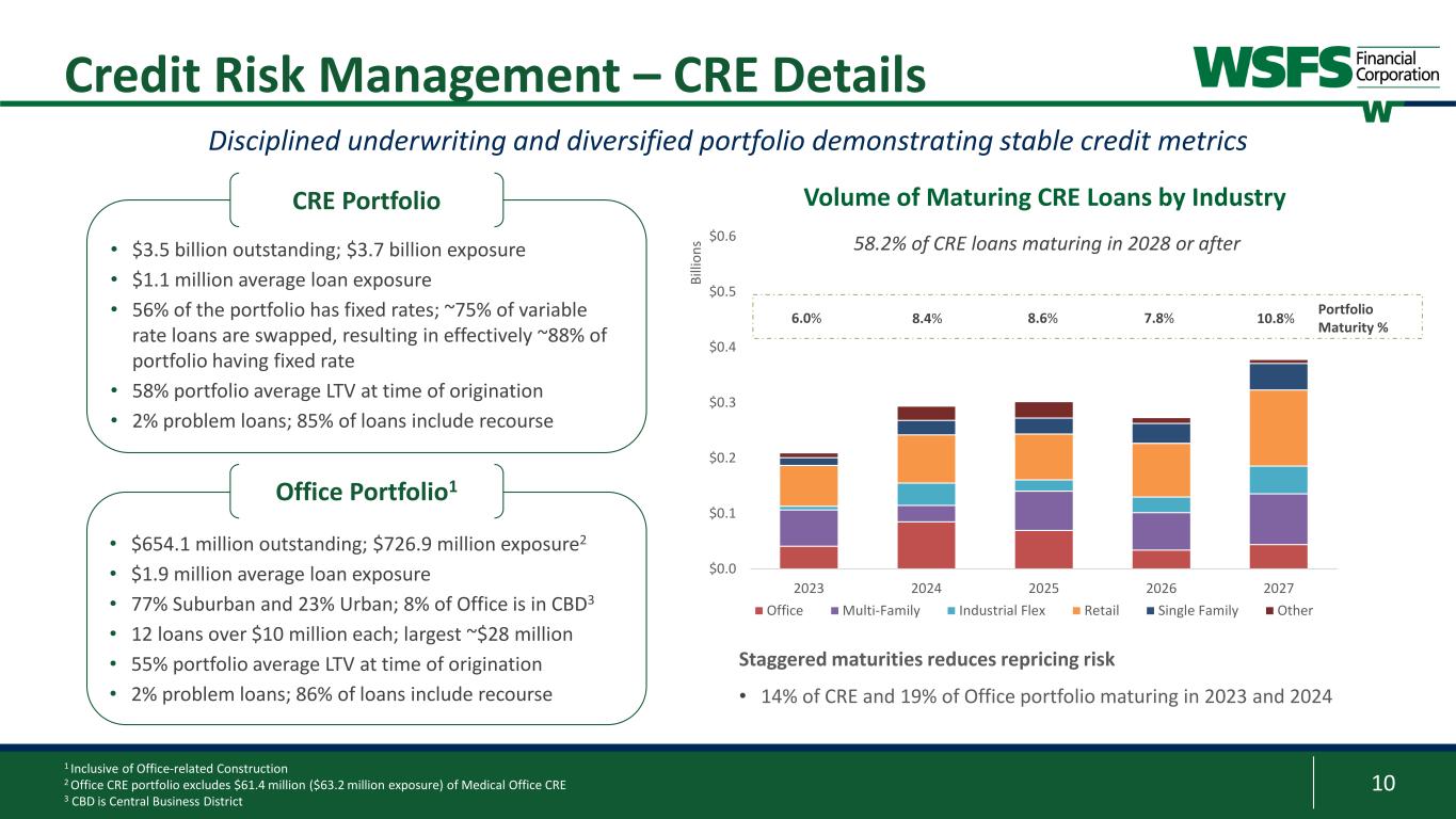 9 Asset Quality 1 Prior to 1Q23, NPA included accruing TDRs 2 Concentration limits are based on relationship exposure, and Tier-1 + ACL; as of June 30, 2023 3 Based on relationship’s outstanding balances 4 Defined as the sum of CRE and Construction (excluding Owner-Occupied) $568 $473 $462 $417 $465 26.24% 23.17% 21.44% 18.65% 20.14% 10% 15% 20% 25% 30% 35% 40% $300 $400 $500 $600 $700 $800 2Q22 3Q22 4Q22 1Q23 2Q23 M ill io ns Problem Assets % of Tier 1 capital plus ACL Problem Assets $34 $37 $43 $33 $34 0.16% 0.19% 0.22% 0.16% 0.16% 0.0% 0.1% 0.2% 0.3% 0.4% 0.5% $0 $20 $40 $60 $80 $100 2Q22 3Q22 4Q22 1Q23 2Q23 M ill io ns Nonperforming Assets % of Total Assets Nonperforming Assets1 $60 $69 $61 $101 $73 0.52% 0.59% 0.51% 0.83% 0.59% 0.0% 0.3% 0.6% 0.9% 1.2% 1.5% $0 $25 $50 $75 $100 $125 $150 $175 $200 2Q22 3Q22 4Q22 1Q23 2Q23 M ill io ns Delinquencies % of Gross Loans Delinquencies $3 $3 $8 $12 $13 0.09% 0.11% 0.26% 0.40% 0.43% 0.0% 0.2% 0.4% 0.6% 0.8% $0 $4 $8 $12 $16 $20 $24 2Q22 3Q22 4Q22 1Q23 2Q23 M ill io ns Net Charge-offs % of Avg. Gross Loans Net Charge-offs • Problem Assets: Driven by select Commercial downgrades related to the macroeconomic forecast • Nonperforming Assets: Remain at stable and low levels • Delinquencies: Improved due to resolution of a few larger commercial maturities and administrative delinquencies • Net Charge-Offs: Commercial up slightly due to two C&I relationships and continued portfolio maturation of NewLane and Upstart • 62% of NCOs due to NewLane and Upstart 2Q23 Performance • 21 distinct concentration limits; all in compliance • House limit of $100 million (no relationships > limit) • 17 Relationships over $50 million; <10% Gross Loans3 • CRE4 concentration: 213% (300% limit) • Construction concentration: 60% (100% limit) • Retail Unsecured concentration: 18% (20% limit) Concentration Limits2