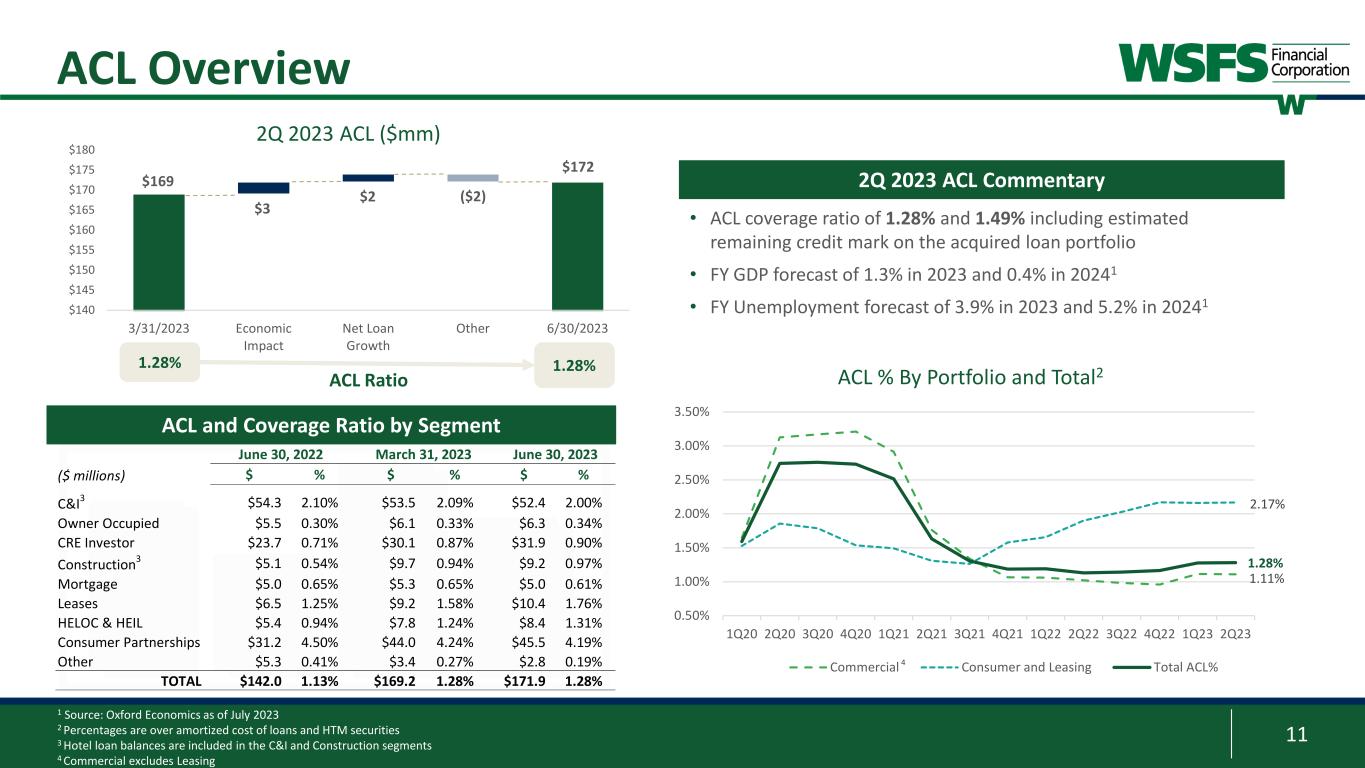 10 Credit Risk Management – CRE Details • $3.5 billion outstanding; $3.7 billion exposure • $1.1 million average loan exposure • 56% of the portfolio has fixed rates; ~75% of variable rate loans are swapped, resulting in effectively ~88% of portfolio having fixed rate • 58% portfolio average LTV at time of origination • 2% problem loans; 85% of loans include recourse CRE Portfolio 1 Inclusive of Office-related Construction 2 Office CRE portfolio excludes $61.4 million ($63.2 million exposure) of Medical Office CRE 3 CBD is Central Business District Disciplined underwriting and diversified portfolio demonstrating stable credit metrics Staggered maturities reduces repricing risk • 14% of CRE and 19% of Office portfolio maturing in 2023 and 2024 $0.0 $0.1 $0.2 $0.3 $0.4 $0.5 $0.6 2023 2024 2025 2026 2027 Bi lli on s Volume of Maturing CRE Loans by Industry Office Multi-Family Industrial Flex Retail Single Family Other 6.0% 8.4% 8.6% 7.8% 10.8% • $654.1 million outstanding; $726.9 million exposure2 • $1.9 million average loan exposure • 77% Suburban and 23% Urban; 8% of Office is in CBD3 • 12 loans over $10 million each; largest ~$28 million • 55% portfolio average LTV at time of origination • 2% problem loans; 86% of loans include recourse Office Portfolio1 58.2% of CRE loans maturing in 2028 or after Portfolio Maturity %