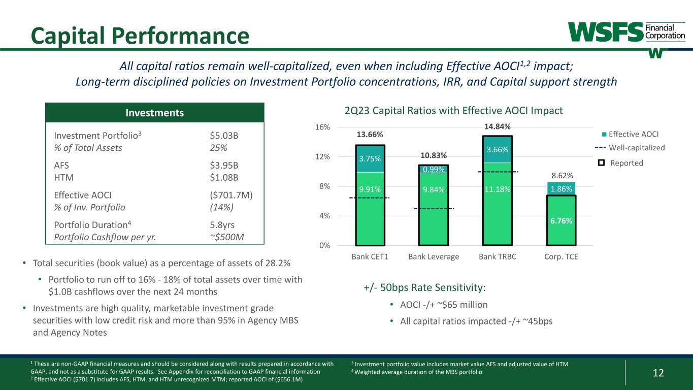 11 ACL Ratio $140 $145 $150 $155 $160 $165 $170 $175 $180 3/31/2023 Economic Impact Net Loan Growth Other 6/30/2023 2Q 2023 ACL ($mm) $3 $169 ($2) $172 $2 1 Source: Oxford Economics as of July 2023 2 Percentages are over amortized cost of loans and HTM securities 3 Hotel loan balances are included in the C&I and Construction segments 4 Commercial excludes Leasing ACL Overview ACL and Coverage Ratio by Segment 2Q 2023 ACL Commentary 1.28% • ACL coverage ratio of 1.28% and 1.49% including estimated remaining credit mark on the acquired loan portfolio • FY GDP forecast of 1.3% in 2023 and 0.4% in 20241 • FY Unemployment forecast of 3.9% in 2023 and 5.2% in 20241 1.28% ($ millions) $ % $ % $ % C&I3 $54.3 2.10% $53.5 2.09% $52.4 2.00% Owner Occupied $5.5 0.30% $6.1 0.33% $6.3 0.34% CRE Investor $23.7 0.71% $30.1 0.87% $31.9 0.90% Construction3 $5.1 0.54% $9.7 0.94% $9.2 0.97% Mortgage $5.0 0.65% $5.3 0.65% $5.0 0.61% Leases $6.5 1.25% $9.2 1.58% $10.4 1.76% HELOC & HEIL $5.4 0.94% $7.8 1.24% $8.4 1.31% Consumer Partnerships $31.2 4.50% $44.0 4.24% $45.5 4.19% Other $5.3 0.41% $3.4 0.27% $2.8 0.19% TOTAL $142.0 1.13% $169.2 1.28% $171.9 1.28% June 30, 2022 March 31, 2023 June 30, 2023 1.11% 2.17% 1.28% 0.50% 1.00% 1.50% 2.00% 2.50% 3.00% 3.50% 1Q20 2Q20 3Q20 4Q20 1Q21 2Q21 3Q21 4Q21 1Q22 2Q22 3Q22 4Q22 1Q23 2Q23 ACL % By Portfolio and Total2 Commercial Consumer and Leasing Total ACL%4