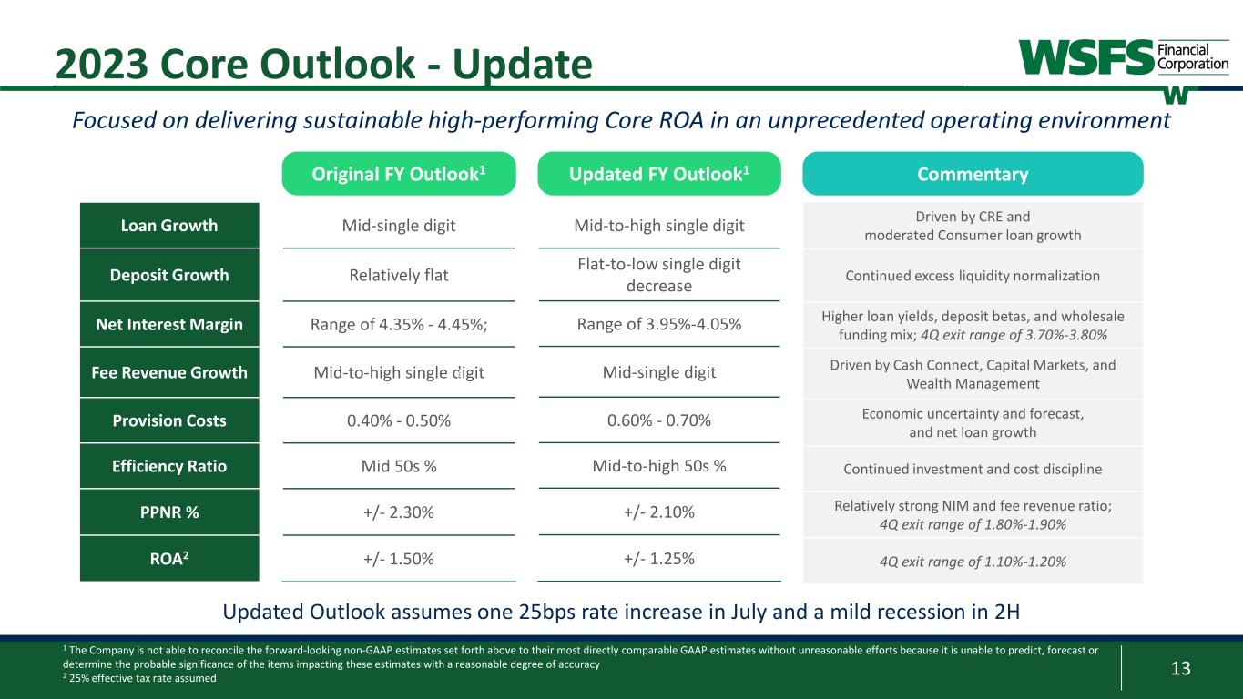 12 Capital Performance All capital ratios remain well-capitalized, even when including Effective AOCI1,2 impact; Long-term disciplined policies on Investment Portfolio concentrations, IRR, and Capital support strength 1 These are non-GAAP financial measures and should be considered along with results prepared in accordance with GAAP, and not as a substitute for GAAP results. See Appendix for reconciliation to GAAP financial information 2 Effective AOCI ($701.7) includes AFS, HTM, and HTM unrecognized MTM; reported AOCI of ($656.1M) • Total securities (book value) as a percentage of assets of 28.2% • Portfolio to run off to 16% - 18% of total assets over time with $1.0B cashflows over the next 24 months • Investments are high quality, marketable investment grade securities with low credit risk and more than 95% in Agency MBS and Agency Notes Investments 9.91% 9.84% 11.18% 6.76% 3.75% 0.99% 3.66% 1.86% 13.66% 10.83% 14.84% 8.62% 0% 4% 8% 12% 16% Bank CET1 Bank Leverage Bank TRBC Corp. TCE Effective AOCI Well-capitalized Reported 2Q23 Capital Ratios with Effective AOCI Impact +/- 50bps Rate Sensitivity: • AOCI -/+ ~$65 million • All capital ratios impacted -/+ ~45bps Investment Portfolio3 $5.03B % of Total Assets 25% Effective AOCI ($701.7M) % of Inv. Portfolio (14%) Portfolio Duration4 5.8yrs Portfolio Cashflow per yr. ~$500M AFS $3.95B HTM $1.08B 3 Investment portfolio value includes market value AFS and adjusted value of HTM 4 Weighted average duration of the MBS portfolio
