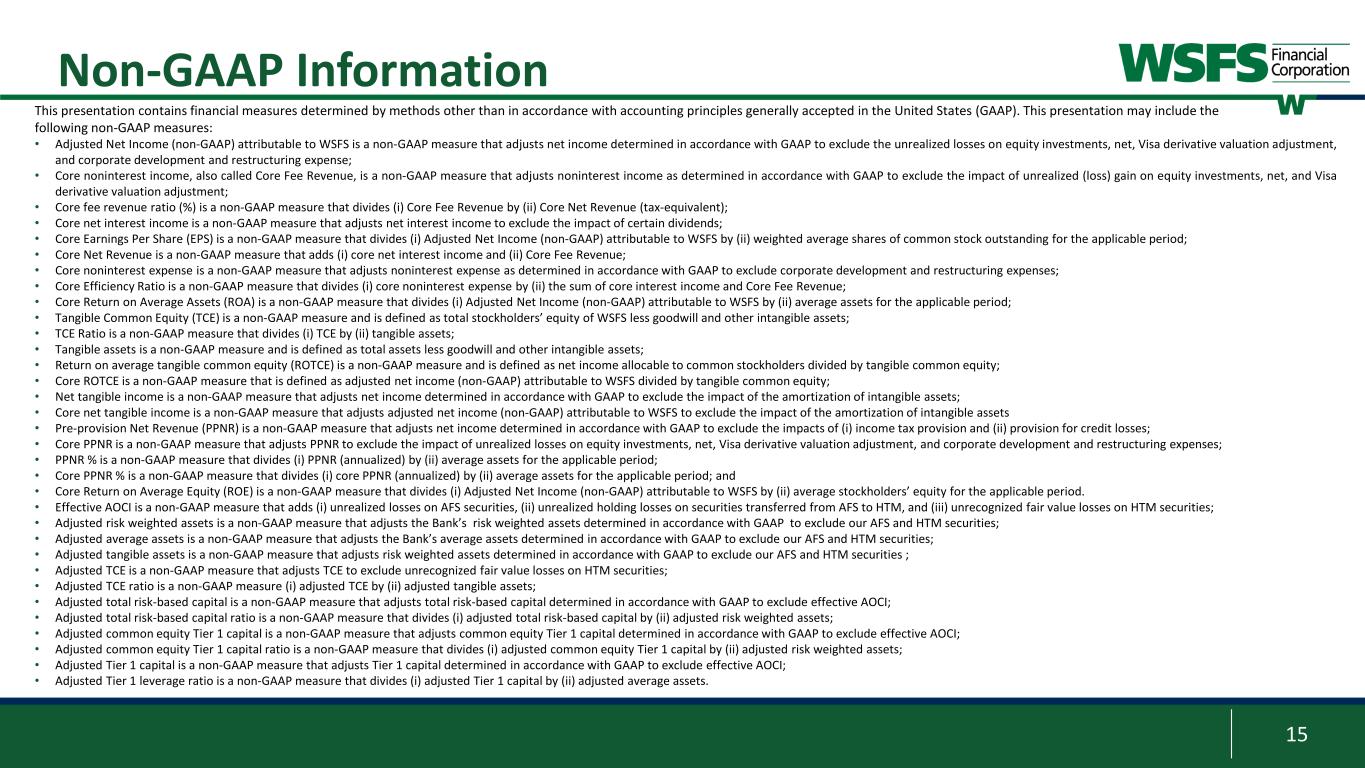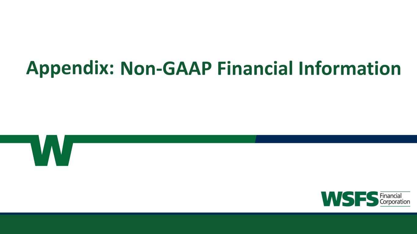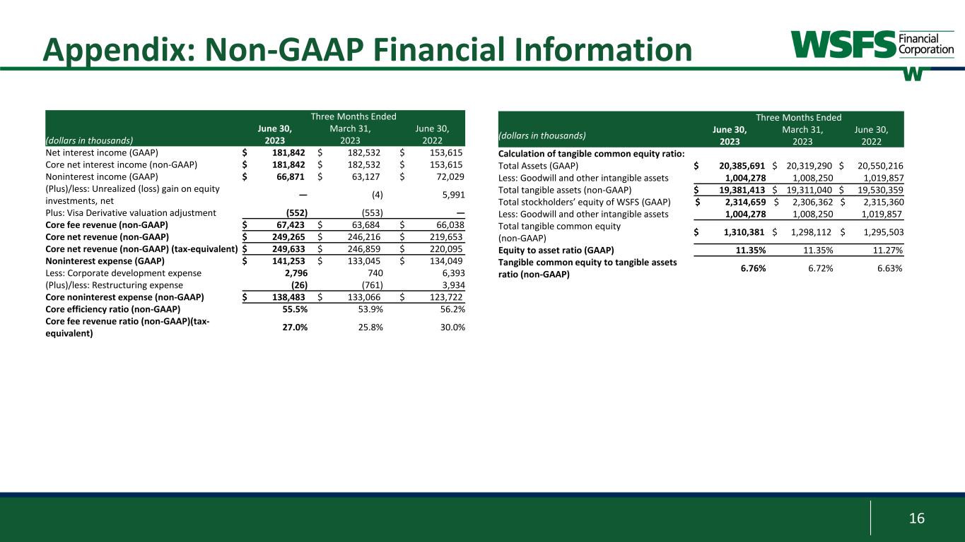 15 Non-GAAP Information This presentation contains financial measures determined by methods other than in accordance with accounting principles generally accepted in the United States (GAAP). This presentation may include the following non-GAAP measures: • Adjusted Net Income (non-GAAP) attributable to WSFS is a non-GAAP measure that adjusts net income determined in accordance with GAAP to exclude the unrealized losses on equity investments, net, Visa derivative valuation adjustment, and corporate development and restructuring expense; • Core noninterest income, also called Core Fee Revenue, is a non-GAAP measure that adjusts noninterest income as determined in accordance with GAAP to exclude the impact of unrealized (loss) gain on equity investments, net, and Visa derivative valuation adjustment; • Core fee revenue ratio (%) is a non-GAAP measure that divides (i) Core Fee Revenue by (ii) Core Net Revenue (tax-equivalent); • Core net interest income is a non-GAAP measure that adjusts net interest income to exclude the impact of certain dividends; • Core Earnings Per Share (EPS) is a non-GAAP measure that divides (i) Adjusted Net Income (non-GAAP) attributable to WSFS by (ii) weighted average shares of common stock outstanding for the applicable period; • Core Net Revenue is a non-GAAP measure that adds (i) core net interest income and (ii) Core Fee Revenue; • Core noninterest expense is a non-GAAP measure that adjusts noninterest expense as determined in accordance with GAAP to exclude corporate development and restructuring expenses; • Core Efficiency Ratio is a non-GAAP measure that divides (i) core noninterest expense by (ii) the sum of core interest income and Core Fee Revenue; • Core Return on Average Assets (ROA) is a non-GAAP measure that divides (i) Adjusted Net Income (non-GAAP) attributable to WSFS by (ii) average assets for the applicable period; • Tangible Common Equity (TCE) is a non-GAAP measure and is defined as total stockholders’ equity of WSFS less goodwill and other intangible assets; • TCE Ratio is a non-GAAP measure that divides (i) TCE by (ii) tangible assets; • Tangible assets is a non-GAAP measure and is defined as total assets less goodwill and other intangible assets; • Return on average tangible common equity (ROTCE) is a non-GAAP measure and is defined as net income allocable to common stockholders divided by tangible common equity; • Core ROTCE is a non-GAAP measure that is defined as adjusted net income (non-GAAP) attributable to WSFS divided by tangible common equity; • Net tangible income is a non-GAAP measure that adjusts net income determined in accordance with GAAP to exclude the impact of the amortization of intangible assets; • Core net tangible income is a non-GAAP measure that adjusts adjusted net income (non-GAAP) attributable to WSFS to exclude the impact of the amortization of intangible assets • Pre-provision Net Revenue (PPNR) is a non-GAAP measure that adjusts net income determined in accordance with GAAP to exclude the impacts of (i) income tax provision and (ii) provision for credit losses; • Core PPNR is a non-GAAP measure that adjusts PPNR to exclude the impact of unrealized losses on equity investments, net, Visa derivative valuation adjustment, and corporate development and restructuring expenses; • PPNR % is a non-GAAP measure that divides (i) PPNR (annualized) by (ii) average assets for the applicable period; • Core PPNR % is a non-GAAP measure that divides (i) core PPNR (annualized) by (ii) average assets for the applicable period; and • Core Return on Average Equity (ROE) is a non-GAAP measure that divides (i) Adjusted Net Income (non-GAAP) attributable to WSFS by (ii) average stockholders’ equity for the applicable period. • Effective AOCI is a non-GAAP measure that adds (i) unrealized losses on AFS securities, (ii) unrealized holding losses on securities transferred from AFS to HTM, and (iii) unrecognized fair value losses on HTM securities; • Adjusted risk weighted assets is a non-GAAP measure that adjusts the Bank’s risk weighted assets determined in accordance with GAAP to exclude our AFS and HTM securities; • Adjusted average assets is a non-GAAP measure that adjusts the Bank’s average assets determined in accordance with GAAP to exclude our AFS and HTM securities; • Adjusted tangible assets is a non-GAAP measure that adjusts risk weighted assets determined in accordance with GAAP to exclude our AFS and HTM securities ; • Adjusted TCE is a non-GAAP measure that adjusts TCE to exclude unrecognized fair value losses on HTM securities; • Adjusted TCE ratio is a non-GAAP measure (i) adjusted TCE by (ii) adjusted tangible assets; • Adjusted total risk-based capital is a non-GAAP measure that adjusts total risk-based capital determined in accordance with GAAP to exclude effective AOCI; • Adjusted total risk-based capital ratio is a non-GAAP measure that divides (i) adjusted total risk-based capital by (ii) adjusted risk weighted assets; • Adjusted common equity Tier 1 capital is a non-GAAP measure that adjusts common equity Tier 1 capital determined in accordance with GAAP to exclude effective AOCI; • Adjusted common equity Tier 1 capital ratio is a non-GAAP measure that divides (i) adjusted common equity Tier 1 capital by (ii) adjusted risk weighted assets; • Adjusted Tier 1 capital is a non-GAAP measure that adjusts Tier 1 capital determined in accordance with GAAP to exclude effective AOCI; • Adjusted Tier 1 leverage ratio is a non-GAAP measure that divides (i) adjusted Tier 1 capital by (ii) adjusted average assets.