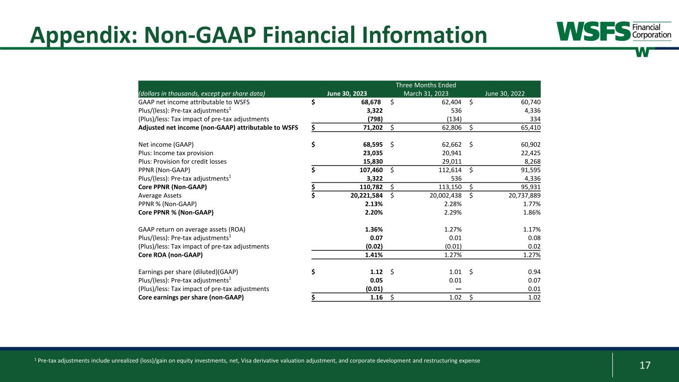 16 Appendix: Non-GAAP Financial Information Three Months Ended (dollars in thousands) June 30, 2023 March 31, 2023 June 30, 2022 Net interest income (GAAP) $ 181,842 $ 182,532 $ 153,615 Core net interest income (non-GAAP) $ 181,842 $ 182,532 $ 153,615 Noninterest income (GAAP) $ 66,871 $ 63,127 $ 72,029 (Plus)/less: Unrealized (loss) gain on equity investments, net — (4) 5,991 Plus: Visa Derivative valuation adjustment (552) (553) — Core fee revenue (non-GAAP) $ 67,423 $ 63,684 $ 66,038 Core net revenue (non-GAAP) $ 249,265 $ 246,216 $ 219,653 Core net revenue (non-GAAP) (tax-equivalent) $ 249,633 $ 246,859 $ 220,095 Noninterest expense (GAAP) $ 141,253 $ 133,045 $ 134,049 Less: Corporate development expense 2,796 740 6,393 (Plus)/less: Restructuring expense (26) (761) 3,934 Core noninterest expense (non-GAAP) $ 138,483 $ 133,066 $ 123,722 Core efficiency ratio (non-GAAP) 55.5% 53.9% 56.2% Core fee revenue ratio (non-GAAP)(tax- equivalent) 27.0% 25.8% 30.0% Three Months Ended (dollars in thousands) June 30, 2023 March 31, 2023 June 30, 2022 Calculation of tangible common equity ratio: Total Assets (GAAP) $ 20,385,691 $ 20,319,290 $ 20,550,216 Less: Goodwill and other intangible assets 1,004,278 1,008,250 1,019,857 Total tangible assets (non-GAAP) $ 19,381,413 $ 19,311,040 $ 19,530,359 Total stockholders’ equity of WSFS (GAAP) $ 2,314,659 $ 2,306,362 $ 2,315,360 Less: Goodwill and other intangible assets 1,004,278 1,008,250 1,019,857 Total tangible common equity (non-GAAP) $ 1,310,381 $ 1,298,112 $ 1,295,503 Equity to asset ratio (GAAP) 11.35% 11.35% 11.27% Tangible common equity to tangible assets ratio (non-GAAP) 6.76% 6.72% 6.63%