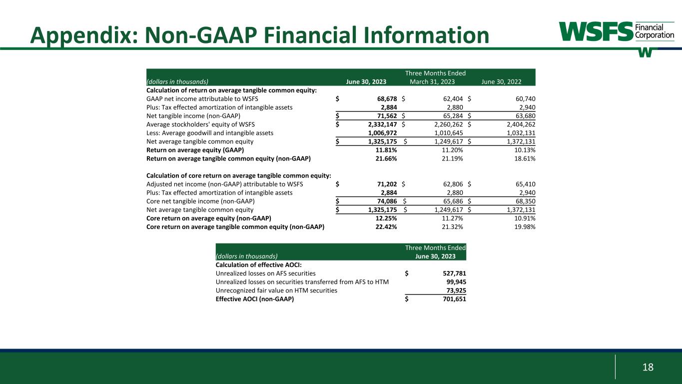 17 Appendix: Non-GAAP Financial Information Three Months Ended (dollars in thousands, except per share data) June 30, 2023 March 31, 2023 June 30, 2022 GAAP net income attributable to WSFS $ 68,678 $ 62,404 $ 60,740 Plus/(less): Pre-tax adjustments1 3,322 536 4,336 (Plus)/less: Tax impact of pre-tax adjustments (798) (134) 334 Adjusted net income (non-GAAP) attributable to WSFS $ 71,202 $ 62,806 $ 65,410 Net income (GAAP) $ 68,595 $ 62,662 $ 60,902 Plus: Income tax provision 23,035 20,941 22,425 Plus: Provision for credit losses 15,830 29,011 8,268 PPNR (Non-GAAP) $ 107,460 $ 112,614 $ 91,595 Plus/(less): Pre-tax adjustments1 3,322 536 4,336 Core PPNR (Non-GAAP) $ 110,782 $ 113,150 $ 95,931 Average Assets $ 20,221,584 $ 20,002,438 $ 20,737,889 PPNR % (Non-GAAP) 2.13% 2.28% 1.77% Core PPNR % (Non-GAAP) 2.20% 2.29% 1.86% GAAP return on average assets (ROA) 1.36% 1.27% 1.17% Plus/(less): Pre-tax adjustments1 0.07 0.01 0.08 (Plus)/less: Tax impact of pre-tax adjustments (0.02) (0.01) 0.02 Core ROA (non-GAAP) 1.41% 1.27% 1.27% Earnings per share (diluted)(GAAP) $ 1.12 $ 1.01 $ 0.94 Plus/(less): Pre-tax adjustments1 0.05 0.01 0.07 (Plus)/less: Tax impact of pre-tax adjustments (0.01) — 0.01 Core earnings per share (non-GAAP) $ 1.16 $ 1.02 $ 1.02 1 Pre-tax adjustments include unrealized (loss)/gain on equity investments, net, Visa derivative valuation adjustment, and corporate development and restructuring expense