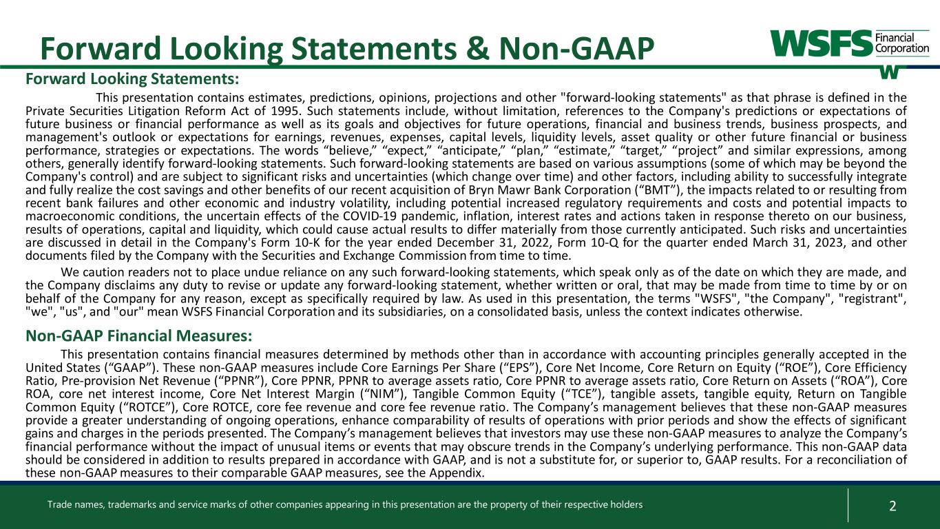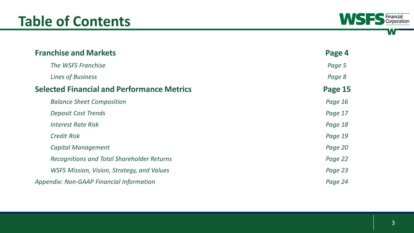 2 Forward Looking Statements & Non-GAAP Forward Looking Statements: This presentation contains estimates, predictions, opinions, projections and other "forward-looking statements" as that phrase is defined in the Private Securities Litigation Reform Act of 1995. Such statements include, without limitation, references to the Company's predictions or expectations of future business or financial performance as well as its goals and objectives for future operations, financial and business trends, business prospects, and management's outlook or expectations for earnings, revenues, expenses, capital levels, liquidity levels, asset quality or other future financial or business performance, strategies or expectations. The words “believe,” “expect,” “anticipate,” “plan,” “estimate,” “target,” “project” and similar expressions, among others, generally identify forward-looking statements. Such forward-looking statements are based on various assumptions (some of which may be beyond the Company's control) and are subject to significant risks and uncertainties (which change over time) and other factors, including ability to successfully integrate and fully realize the cost savings and other benefits of our recent acquisition of Bryn Mawr Bank Corporation (“BMT”), the impacts related to or resulting from recent bank failures and other economic and industry volatility, including potential increased regulatory requirements and costs and potential impacts to macroeconomic conditions, the uncertain effects of the COVID-19 pandemic, inflation, interest rates and actions taken in response thereto on our business, results of operations, capital and liquidity, which could cause actual results to differ materially from those currently anticipated. Such risks and uncertainties are discussed in detail in the Company's Form 10-K for the year ended December 31, 2022, Form 10-Q for the quarter ended March 31, 2023, and other documents filed by the Company with the Securities and Exchange Commission from time to time. We caution readers not to place undue reliance on any such forward-looking statements, which speak only as of the date on which they are made, and the Company disclaims any duty to revise or update any forward-looking statement, whether written or oral, that may be made from time to time by or on behalf of the Company for any reason, except as specifically required by law. As used in this presentation, the terms "WSFS", "the Company", "registrant", "we", "us", and "our" mean WSFS Financial Corporation and its subsidiaries, on a consolidated basis, unless the context indicates otherwise. Non-GAAP Financial Measures: This presentation contains financial measures determined by methods other than in accordance with accounting principles generally accepted in the United States (“GAAP”). These non-GAAP measures include Core Earnings Per Share (“EPS”), Core Net Income, Core Return on Equity (“ROE”), Core Efficiency Ratio, Pre-provision Net Revenue (“PPNR”), Core PPNR, PPNR to average assets ratio, Core PPNR to average assets ratio, Core Return on Assets (“ROA”), Core ROA, core net interest income, Core Net Interest Margin (“NIM”), Tangible Common Equity (“TCE”), tangible assets, tangible equity, Return on Tangible Common Equity (“ROTCE”), Core ROTCE, core fee revenue and core fee revenue ratio. The Company’s management believes that these non-GAAP measures provide a greater understanding of ongoing operations, enhance comparability of results of operations with prior periods and show the effects of significant gains and charges in the periods presented. The Company’s management believes that investors may use these non-GAAP measures to analyze the Company’s financial performance without the impact of unusual items or events that may obscure trends in the Company’s underlying performance. This non-GAAP data should be considered in addition to results prepared in accordance with GAAP, and is not a substitute for, or superior to, GAAP results. For a reconciliation of these non-GAAP measures to their comparable GAAP measures, see the Appendix. Trade names, trademarks and service marks of other companies appearing in this presentation are the property of their respective holders.
