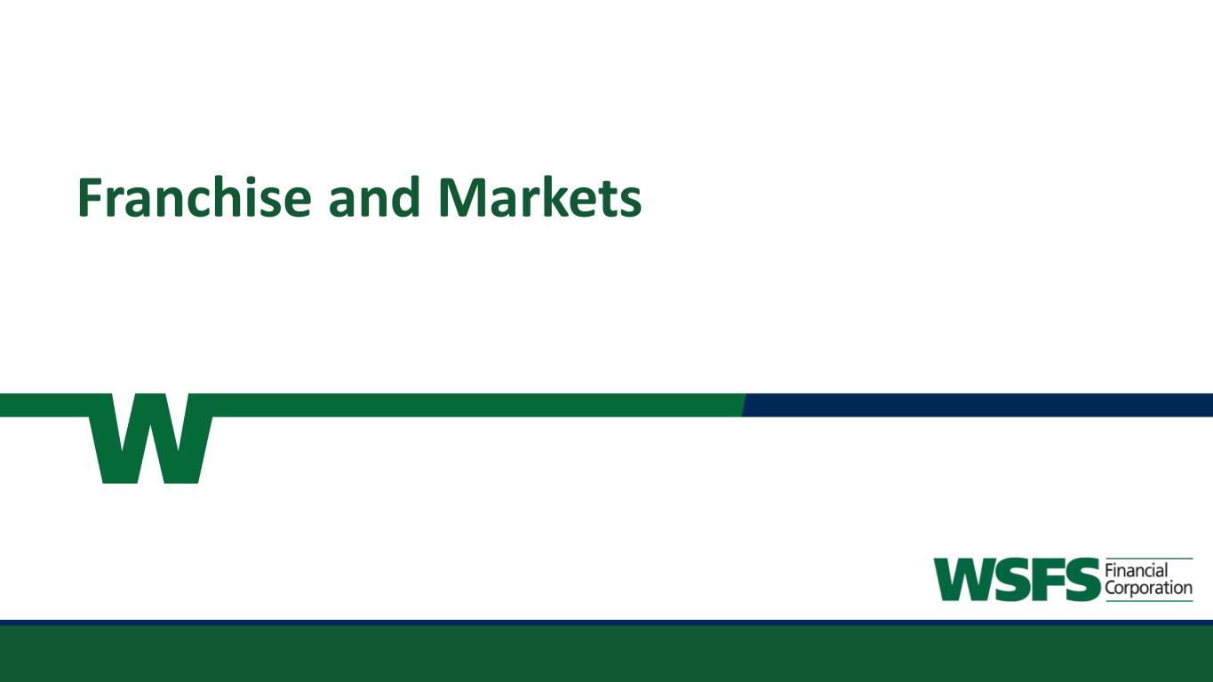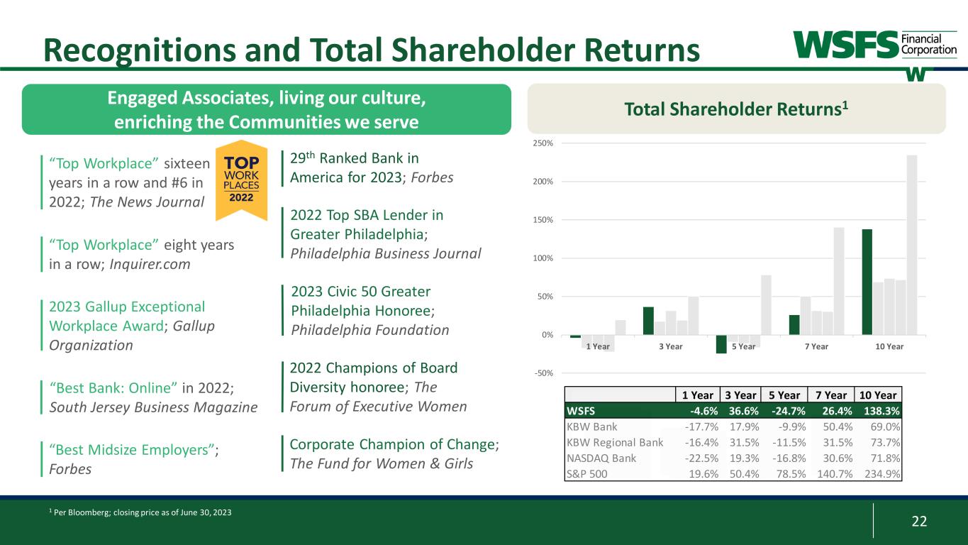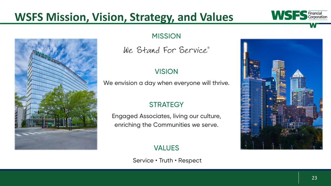 22 Corporate Champion of Change; The Fund for Women & Girls 2022 Champions of Board Diversity honoree; The Forum of Executive Women 2023 Civic 50 Greater Philadelphia Honoree; Philadelphia Foundation 29th Ranked Bank in America for 2023; Forbes 2022 Top SBA Lender in Greater Philadelphia; Philadelphia Business Journal 1 Per Bloomberg; closing price as of June 30, 2023 Recognitions and Total Shareholder Returns “Top Workplace” sixteen years in a row and #6 in 2022; The News Journal “Top Workplace” eight years in a row; Inquirer.com “Best Midsize Employers”; Forbes 2023 Gallup Exceptional Workplace Award; Gallup Organization Engaged Associates, living our culture, enriching the Communities we serve Total Shareholder Returns1 “Best Bank: Online” in 2022; South Jersey Business Magazine -50% 0% 50% 100% 150% 200% 250% 1 Year 3 Year 5 Year 7 Year 10 Year 1 Year 3 Year 5 Year 7 Year 10 Year WSFS -4.6% 36.6% -24.7% 26.4% 138.3% KBW Bank -17.7% 17.9% -9.9% 50.4% 69.0% KBW Regional Bank -16.4% 31.5% -11.5% 31.5% 73.7% NASDAQ Bank -22.5% 19.3% -16.8% 30.6% 71.8% S&P 500 19.6% 50.4% 78.5% 140.7% 234.9%