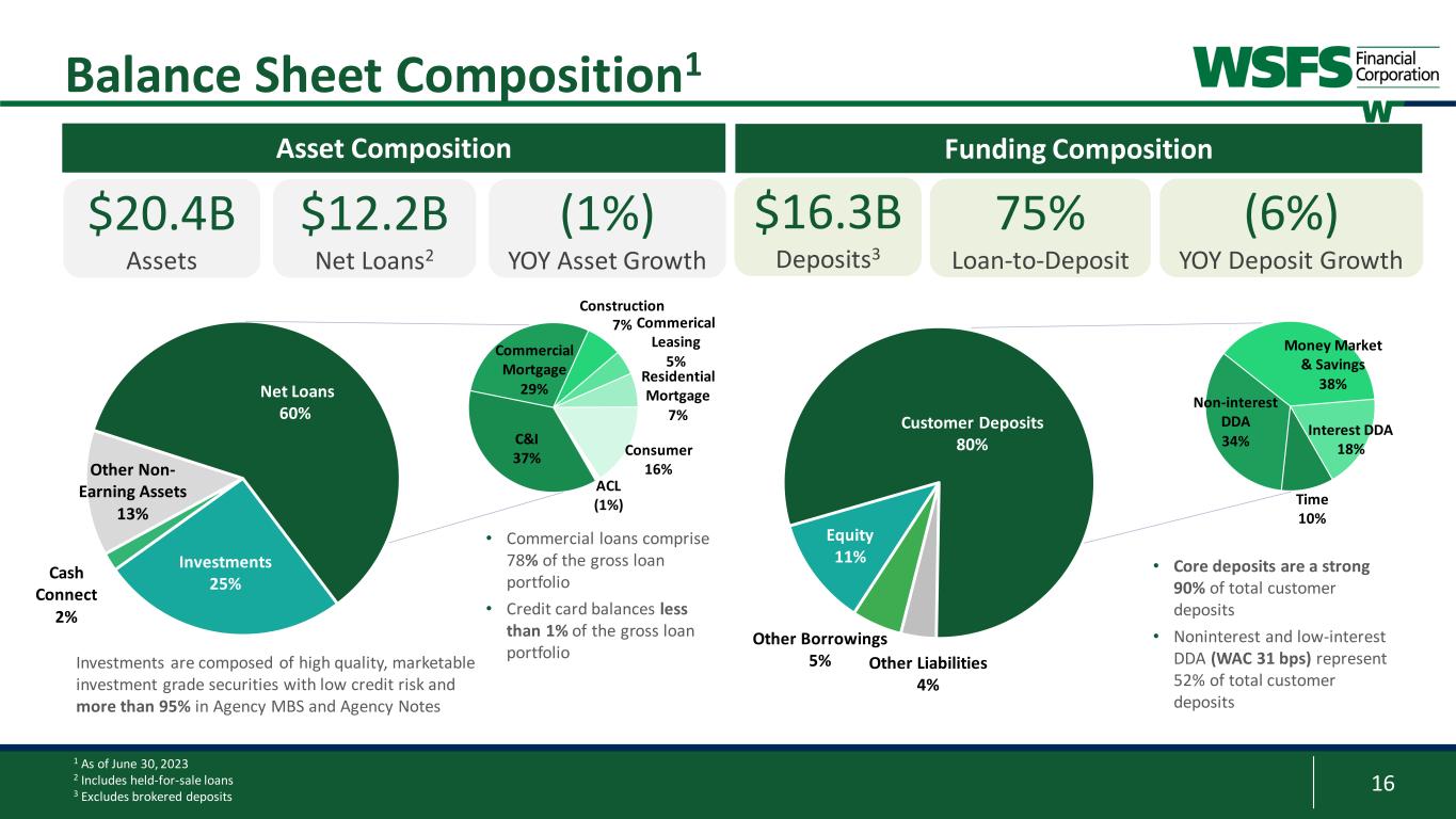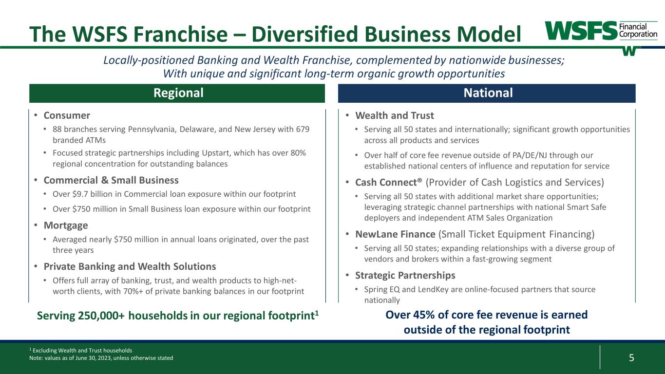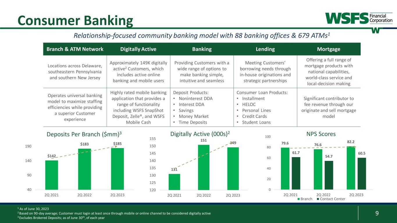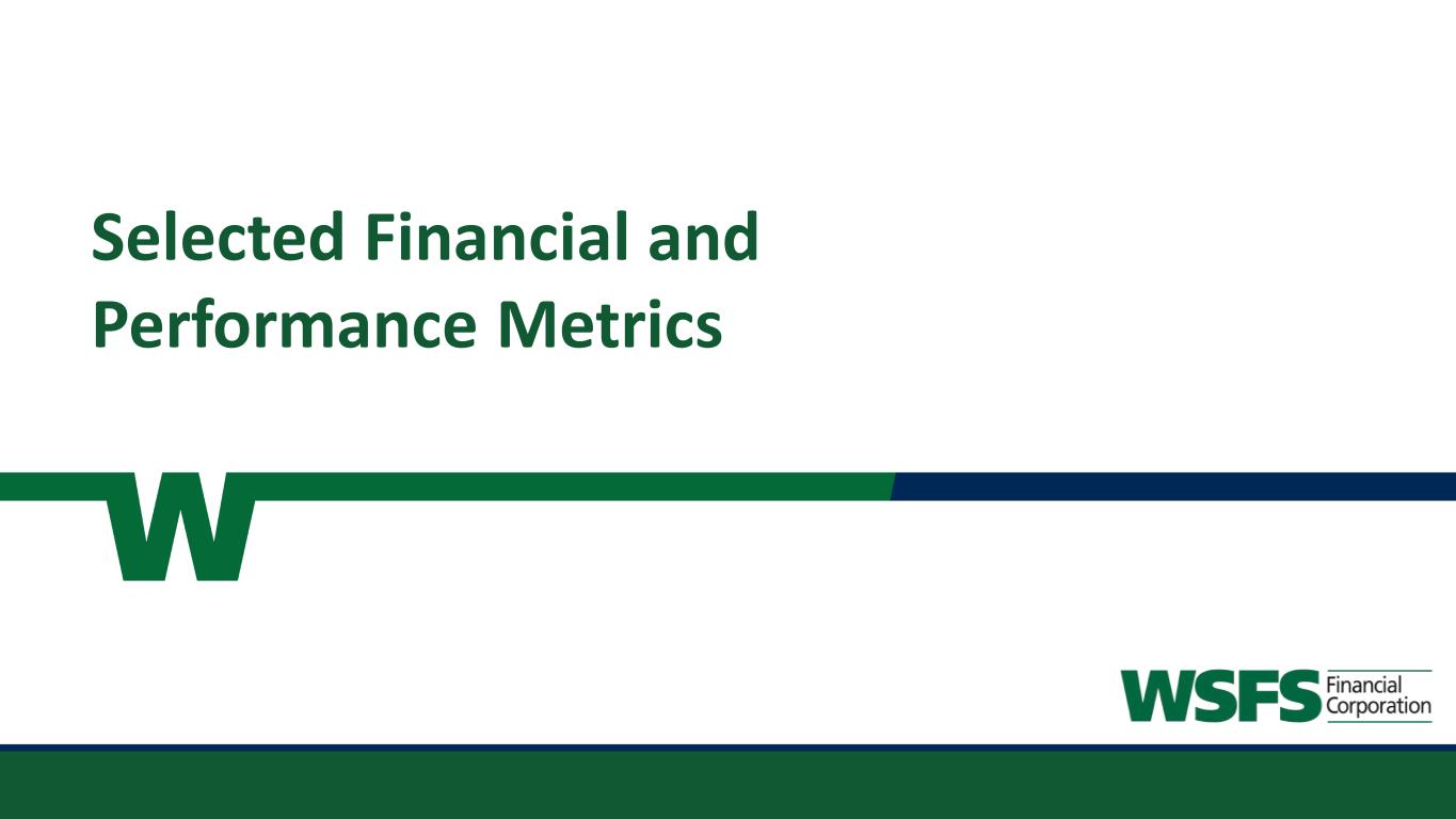 22 Corporate Champion of Change; The Fund for Women & Girls 2022 Champions of Board Diversity honoree; The Forum of Executive Women 2023 Civic 50 Greater Philadelphia Honoree; Philadelphia Foundation 29th Ranked Bank in America for 2023; Forbes 2022 Top SBA Lender in Greater Philadelphia; Philadelphia Business Journal 1 Per Bloomberg; closing price as of June 30, 2023 Recognitions and Total Shareholder Returns “Top Workplace” sixteen years in a row and #6 in 2022; The News Journal “Top Workplace” eight years in a row; Inquirer.com “Best Midsize Employers”; Forbes 2023 Gallup Exceptional Workplace Award; Gallup Organization Engaged Associates, living our culture, enriching the Communities we serve Total Shareholder Returns1 “Best Bank: Online” in 2022; South Jersey Business Magazine -50% 0% 50% 100% 150% 200% 250% 1 Year 3 Year 5 Year 7 Year 10 Year 1 Year 3 Year 5 Year 7 Year 10 Year WSFS -4.6% 36.6% -24.7% 26.4% 138.3% KBW Bank -17.7% 17.9% -9.9% 50.4% 69.0% KBW Regional Bank -16.4% 31.5% -11.5% 31.5% 73.7% NASDAQ Bank -22.5% 19.3% -16.8% 30.6% 71.8% S&P 500 19.6% 50.4% 78.5% 140.7% 234.9%