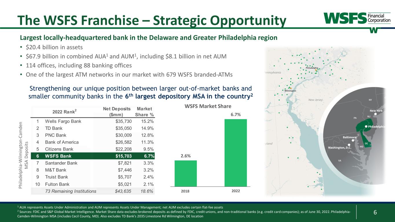 5 • Consumer • 88 branches serving Pennsylvania, Delaware, and New Jersey with 679 branded ATMs • Focused strategic partnerships including Upstart, which has over 80% regional concentration for outstanding balances • Commercial & Small Business • Over $9.7 billion in Commercial loan exposure within our footprint • Over $750 million in Small Business loan exposure within our footprint • Mortgage • Averaged nearly $750 million in annual loans originated, over the past three years • Private Banking and Wealth Solutions • Offers full array of banking, trust, and wealth products to high-net- worth clients, with 70%+ of private banking balances in our footprint • Wealth and Trust • Serving all 50 states and internationally; significant growth opportunities across all products and services • Over half of core fee revenue outside of PA/DE/NJ through our established national centers of influence and reputation for service • Cash Connect® (Provider of Cash Logistics and Services) • Serving all 50 states with additional market share opportunities; leveraging strategic channel partnerships with national Smart Safe deployers and independent ATM Sales Organization • NewLane Finance (Small Ticket Equipment Financing) • Serving all 50 states; expanding relationships with a diverse group of vendors and brokers within a fast-growing segment • Strategic Partnerships • Spring EQ and LendKey are online-focused partners that source nationally Regional National The WSFS Franchise – Diversified Business Model Locally-positioned Banking and Wealth Franchise, complemented by nationwide businesses; With unique and significant long-term organic growth opportunities 1 Excluding Wealth and Trust households Note: values as of June 30, 2023, unless otherwise stated Over 45% of core fee revenue is earned outside of the regional footprint Serving 250,000+ households in our regional footprint1