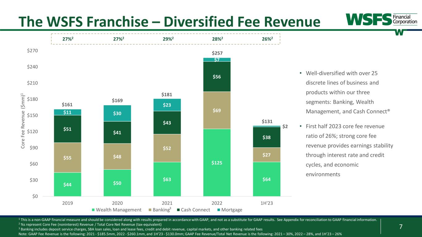 6 2.6% 6.7% WSFS Market Share 2018 2022 1 AUA represents Assets Under Administration and AUM represents Assets Under Management; net AUM excludes certain flat-fee assets 2 Sources: FDIC and S&P Global Market Intelligence. Market Share data excludes brokered deposits as defined by FDIC, credit unions, and non-traditional banks (e.g. credit card companies); as of June 30, 2022. Philadelphia- Camden-Wilmington MSA (includes Cecil County, MD). Also excludes TD Bank’s 2035 Limestone Rd Wilmington, DE location The WSFS Franchise – Strategic Opportunity Strengthening our unique position between larger out-of-market banks and smaller community banks in the 6th largest depository MSA in the country2 Largest locally-headquartered bank in the Delaware and Greater Philadelphia region • $20.4 billion in assets • $67.9 billion in combined AUA1 and AUM1, including $8.1 billion in net AUM • 114 offices, including 88 banking offices • One of the largest ATM networks in our market with 679 WSFS branded-ATMs Net Deposits ($mm) Market Share % 1 Wells Fargo Bank $35,730 15.2% 2 TD Bank $35,050 14.9% 3 PNC Bank $30,009 12.8% 4 Bank of America $26,582 11.3% 5 Citizens Bank $22,208 9.5% 6 WSFS Bank $15,703 6.7% 7 Santander Bank $7,821 3.3% 8 M&T Bank $7,446 3.2% 9 Truist Bank $5,707 2.4% 10 Fulton Bank $5,021 2.1% 73 Remaining Institutions $43,635 18.6% 2022 Rank2 Ph ila de lp hi a- W ilm in gt on -C am de n M SA D ep os its