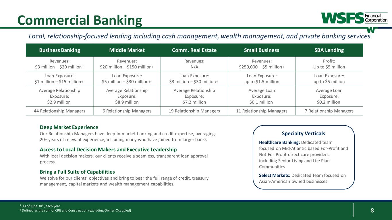 7 The WSFS Franchise – Diversified Fee Revenue 1 This is a non-GAAP financial measure and should be considered along with results prepared in accordance with GAAP, and not as a substitute for GAAP results. See Appendix for reconciliation to GAAP financial information. 2 %s represent Core Fee (noninterest) Revenue / Total Core Net Revenue (tax-equivalent) 3 Banking includes deposit service charges, SBA loan sales, loan and lease fees, credit and debit revenue, capital markets, and other banking related fees Note: GAAP Fee Revenue is the following: 2021 - $185.5mm, 2022 - $260.1mm, and 1H’23 - $130.0mm; GAAP Fee Revenue/Total Net Revenue is the following: 2021 – 30%, 2022 – 28%, and 1H’23 – 26% $44 $50 $63 $125 $64 $55 $48 $52 $69 $27 $51 $41 $43 $56 $38 $11 $30 $23 $7 $2 $0 $30 $60 $90 $120 $150 $180 $210 $240 $270 2019 2020 2021 2022 1H'23 Co re F ee R ev en ue ( $m m )1 Wealth Management Banking Cash Connect Mortgage 27%227%2 29%2 28%2 • Well-diversified with over 25 discrete lines of business and products within our three segments: Banking, Wealth Management, and Cash Connect® • First half 2023 core fee revenue ratio of 26%; strong core fee revenue provides earnings stability through interest rate and credit cycles, and economic environments 3 26%2 $161 $169 $181 $257 $131