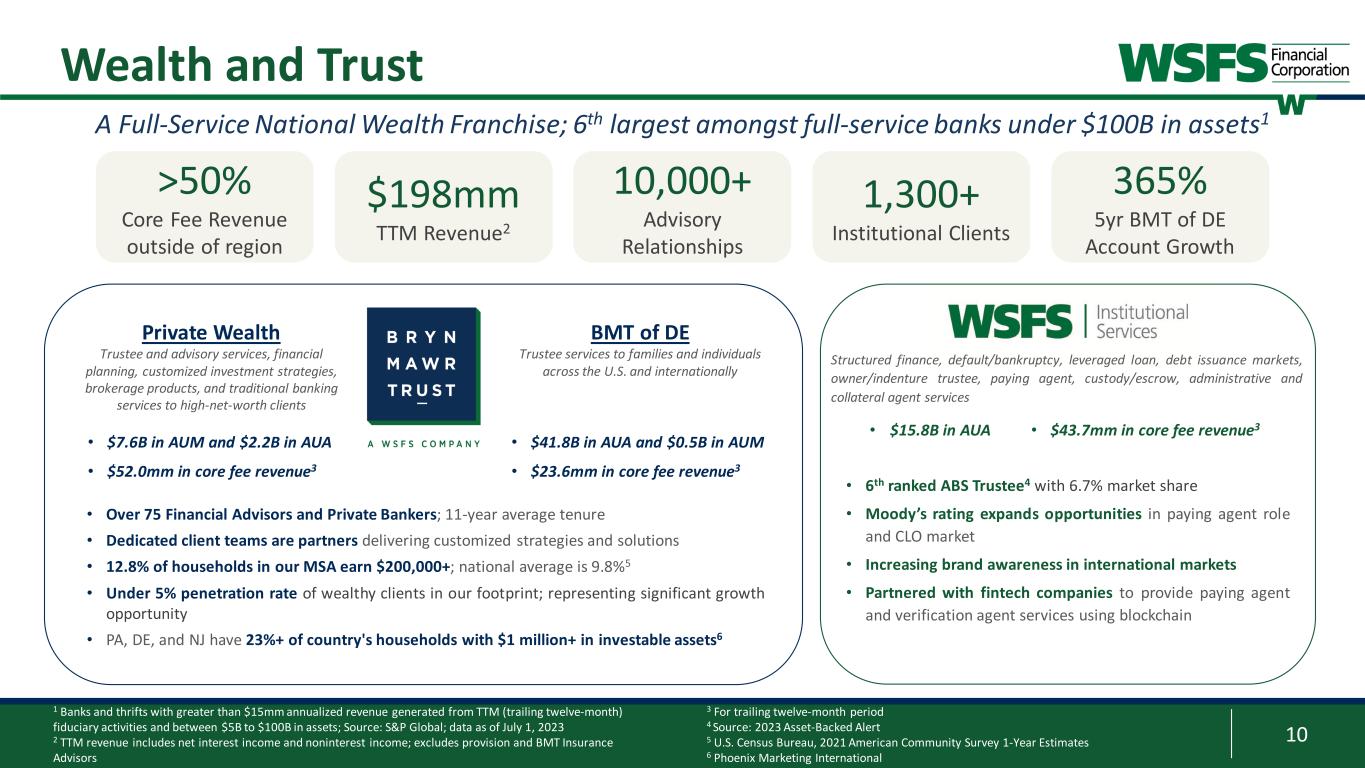 9 Branch & ATM Network Digitally Active Banking Lending Mortgage Locations across Delaware, southeastern Pennsylvania and southern New Jersey Approximately 149K digitally active2 Customers, which includes active online banking and mobile users Providing Customers with a wide range of options to make banking simple, intuitive and seamless Meeting Customers’ borrowing needs through in-house originations and strategic partnerships Offering a full range of mortgage products with national capabilities, world-class service and local-decision making Operates universal banking model to maximize staffing efficiencies while providing a superior Customer experience Highly rated mobile banking application that provides a range of functionality including WSFS SnapShot Deposit, Zelle®, and WSFS Mobile Cash Deposit Products: • Noninterest DDA • Interest DDA • Savings • Money Market • Time Deposits Consumer Loan Products: • Installment • HELOC • Personal Lines • Credit Cards • Student Loans Significant contributor to fee revenue through our originate and sell mortgage model 1 As of June 30, 2023 2 Based on 90-day average; Customer must login at least once through mobile or online channel to be considered digitally active 3 Excludes Brokered Deposits; as of June 30th, of each year Relationship-focused community banking model with 88 banking offices & 679 ATMs1 Consumer Banking $142 $183 $185 40 90 140 190 2Q 2021 2Q 2022 2Q 2023 Deposits Per Branch ($mm)3 131 151 149 120 125 130 135 140 145 150 155 2Q 2021 2Q 2022 2Q 2023 Digitally Active (000s)2 79.6 76.6 82.2 61.7 54.7 60.5 0 20 40 60 80 100 2Q 2021 2Q 2022 2Q 2023 NPS Scores Branch Contact Center
