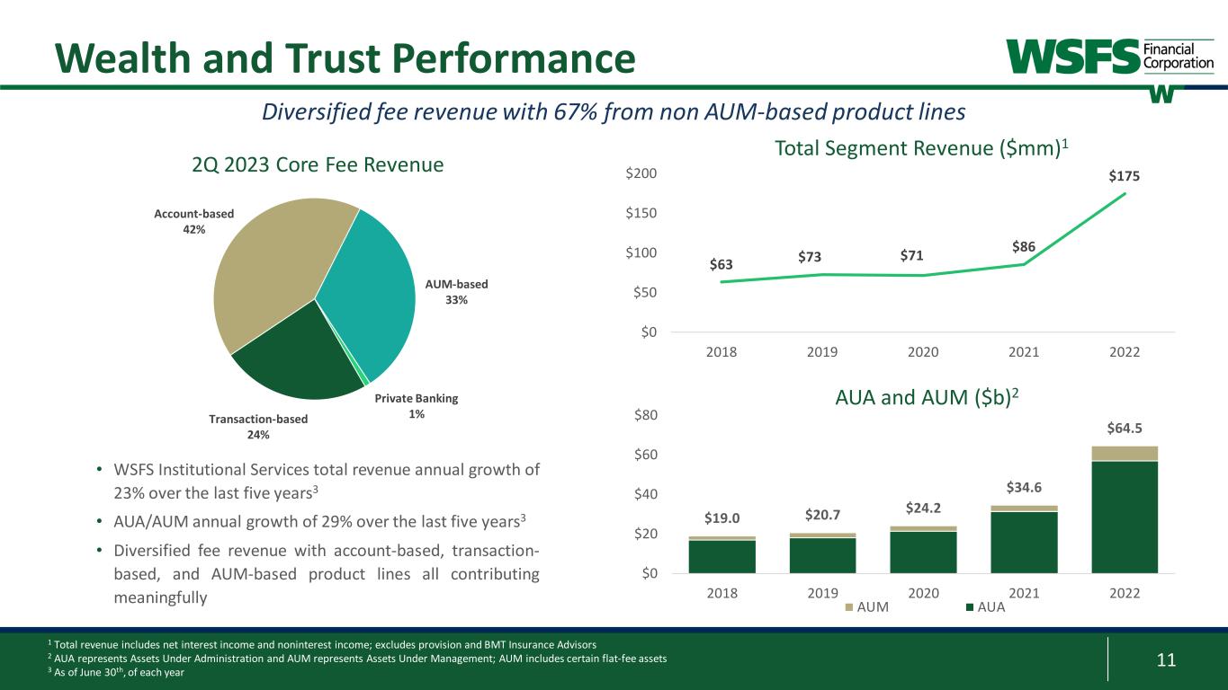 10 1 Banks and thrifts with greater than $15mm annualized revenue generated from TTM (trailing twelve-month) fiduciary activities and between $5B to $100B in assets; Source: S&P Global; data as of July 1, 2023 2 TTM revenue includes net interest income and noninterest income; excludes provision and BMT Insurance Advisors Wealth and Trust A Full-Service National Wealth Franchise; 6th largest amongst full-service banks under $100B in assets1 • Over 75 Financial Advisors and Private Bankers; 11-year average tenure • Dedicated client teams are partners delivering customized strategies and solutions • 12.8% of households in our MSA earn $200,000+; national average is 9.8%5 • Under 5% penetration rate of wealthy clients in our footprint; representing significant growth opportunity • PA, DE, and NJ have 23%+ of country's households with $1 million+ in investable assets6 Private Wealth Trustee and advisory services, financial planning, customized investment strategies, brokerage products, and traditional banking services to high-net-worth clients • 6th ranked ABS Trustee4 with 6.7% market share • Moody’s rating expands opportunities in paying agent role and CLO market • Increasing brand awareness in international markets • Partnered with fintech companies to provide paying agent and verification agent services using blockchain 1,300+ Institutional Clients 10,000+ Advisory Relationships $198mm TTM Revenue2 >50% Core Fee Revenue outside of region 365% 5yr BMT of DE Account Growth BMT of DE Trustee services to families and individuals across the U.S. and internationally • $15.8B in AUA • $43.7mm in core fee revenue3 Structured finance, default/bankruptcy, leveraged loan, debt issuance markets, owner/indenture trustee, paying agent, custody/escrow, administrative and collateral agent services 3 For trailing twelve-month period 4 Source: 2023 Asset-Backed Alert 5 U.S. Census Bureau, 2021 American Community Survey 1-Year Estimates 6 Phoenix Marketing International • $7.6B in AUM and $2.2B in AUA • $52.0mm in core fee revenue3 • $41.8B in AUA and $0.5B in AUM • $23.6mm in core fee revenue3