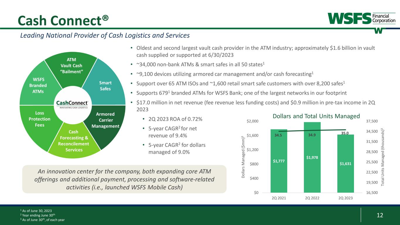 11 Transaction-based 24% Account-based 42% AUM-based 33% Private Banking 1% 2Q 2023 Core Fee Revenue $19.0 $20.7 $24.2 $34.6 $64.5 $0 $20 $40 $60 $80 2018 2019 2020 2021 2022 AUM AUA AUA and AUM ($b)2 1 Total revenue includes net interest income and noninterest income; excludes provision and BMT Insurance Advisors 2 AUA represents Assets Under Administration and AUM represents Assets Under Management; AUM includes certain flat-fee assets 3 As of June 30th, of each year Wealth and Trust Performance Total Segment Revenue ($mm)1 $63 $73 $71 $86 $175 $0 $50 $100 $150 $200 2018 2019 2020 2021 2022 • WSFS Institutional Services total revenue annual growth of 23% over the last five years3 • AUA/AUM annual growth of 29% over the last five years3 • Diversified fee revenue with account-based, transaction- based, and AUM-based product lines all contributing meaningfully Diversified fee revenue with 67% from non AUM-based product lines