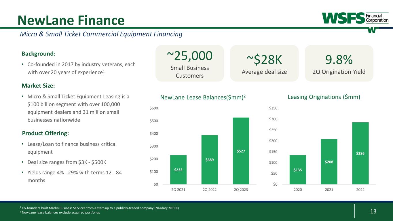 12 • Oldest and second largest vault cash provider in the ATM industry; approximately $1.6 billion in vault cash supplied or supported at 6/30/2023 • ~34,000 non-bank ATMs & smart safes in all 50 states1 • ~9,100 devices utilizing armored car management and/or cash forecasting1 • Support over 65 ATM ISOs and ~1,600 retail smart safe customers with over 8,200 safes1 • Supports 6791 branded ATMs for WSFS Bank; one of the largest networks in our footprint • $17.0 million in net revenue (fee revenue less funding costs) and $0.9 million in pre-tax income in 2Q 2023 • 2Q 2023 ROA of 0.72% • 5-year CAGR2 for net revenue of 9.4% • 5-year CAGR2 for dollars managed of 9.0% 1 As of June 30, 2023 2 Year ending June 30th 3 As of June 30th, of each year ATM Vault Cash “Bailment” Smart Safes Armored Carrier Management Cash Forecasting & Reconcilement Services Loss Protection Fees WSFS Branded ATMs Leading National Provider of Cash Logistics and Services Cash Connect® An innovation center for the company, both expanding core ATM offerings and additional payment, processing and software-related activities (i.e., launched WSFS Mobile Cash) Dollars and Total Units Managed $1,777 $1,978 $1,631 34.5 34.9 35.0 16,500 19,500 22,500 25,500 28,500 31,500 34,500 37,500 $0 $400 $800 $1,200 $1,600 $2,000 2Q 2021 2Q 2022 2Q 2023 To ta l U ni ts M an ag ed (t ho us an ds )3 Do lla rs M an ag ed ($ m m )3