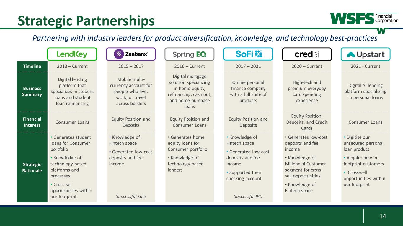 13 NewLane Finance Background: • Co-founded in 2017 by industry veterans, each with over 20 years of experience1 Market Size: • Micro & Small Ticket Equipment Leasing is a $100 billion segment with over 100,000 equipment dealers and 31 million small businesses nationwide Product Offering: • Lease/Loan to finance business critical equipment • Deal size ranges from $3K - $500K • Yields range 4% - 29% with terms 12 - 84 months Micro & Small Ticket Commercial Equipment Financing 1 Co-founders built Marlin Business Services from a start-up to a publicly-traded company (Nasdaq: MRLN) 2 NewLane lease balances exclude acquired portfolios $135 $208 $286 $0 $50 $100 $150 $200 $250 $300 $350 2020 2021 2022 Leasing Originations ($mm) $232 $389 $527 $0 $100 $200 $300 $400 $500 $600 2Q 2021 2Q 2022 2Q 2023 NewLane Lease Balances($mm)2 9.8% 2Q Origination Yield ~25,000 Small Business Customers ~$28K Average deal size