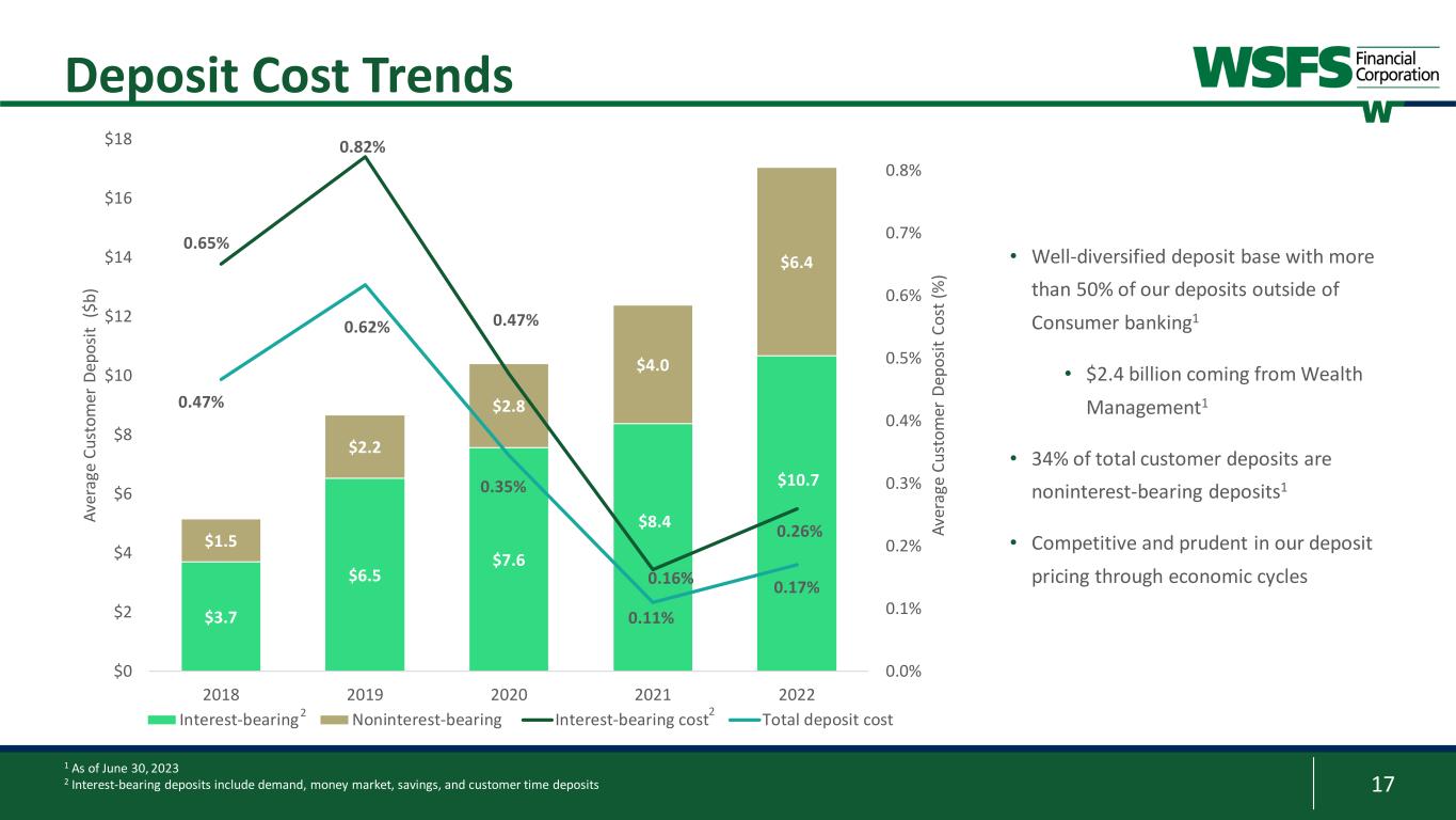 16 Time 10% Non-interest DDA 34% Money Market & Savings 38% Interest DDA 18% Balance Sheet Composition1 C&I 37% Commercial Mortgage 29% Construction 7% Commerical Leasing 5% Residential Mortgage 7% Consumer 16% ACL (1%) Investments 25%Cash Connect 2% Other Non- Earning Assets 13% Net Loans 60% • Commercial loans comprise 78% of the gross loan portfolio • Credit card balances less than 1% of the gross loan portfolio Equity 11% Customer Deposits 80% Investments are composed of high quality, marketable investment grade securities with low credit risk and more than 95% in Agency MBS and Agency Notes $20.4B Assets $12.2B Net Loans2 Asset Composition (1%) YOY Asset Growth Funding Composition $16.3B Deposits3 75% Loan-to-Deposit (6%) YOY Deposit Growth Other Borrowings 5% Other Liabilities 4% 1 As of June 30, 2023 2 Includes held-for-sale loans 3 Excludes brokered deposits • Core deposits are a strong 90% of total customer deposits • Noninterest and low-interest DDA (WAC 31 bps) represent 52% of total customer deposits