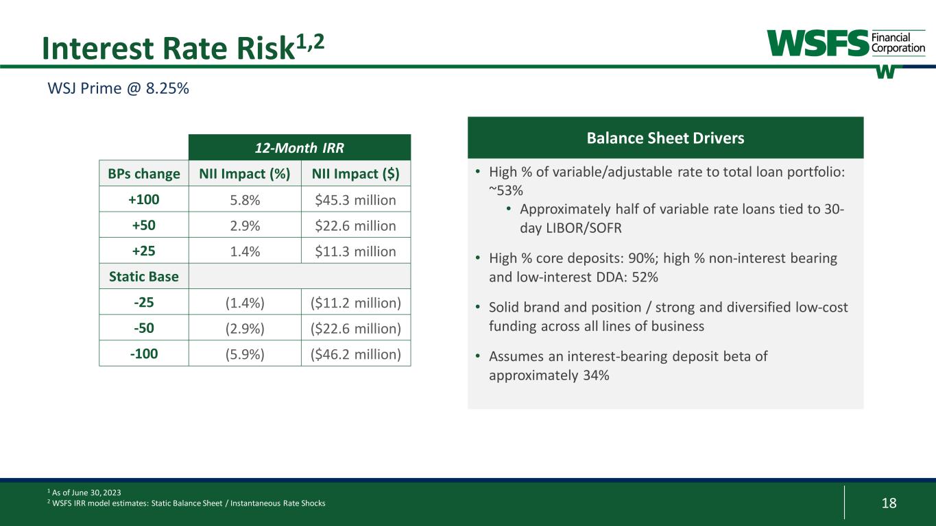 17 $3.7 $6.5 $7.6 $8.4 $10.7 $1.5 $2.2 $2.8 $4.0 $6.4 0.65% 0.82% 0.47% 0.16% 0.26% 0.47% 0.62% 0.35% 0.11% 0.17% 0.0% 0.1% 0.2% 0.3% 0.4% 0.5% 0.6% 0.7% 0.8% $0 $2 $4 $6 $8 $10 $12 $14 $16 $18 2018 2019 2020 2021 2022 Av er ag e Cu st om er D ep os it Co st (% ) Av er ag e Cu st om er D ep os it ($ b) Interest-bearing Noninterest-bearing Interest-bearing cost Total deposit cost Deposit Cost Trends 1 As of June 30, 2023 2 Interest-bearing deposits include demand, money market, savings, and customer time deposits • Well-diversified deposit base with more than 50% of our deposits outside of Consumer banking1 • $2.4 billion coming from Wealth Management1 • 34% of total customer deposits are noninterest-bearing deposits1 • Competitive and prudent in our deposit pricing through economic cycles 2 2