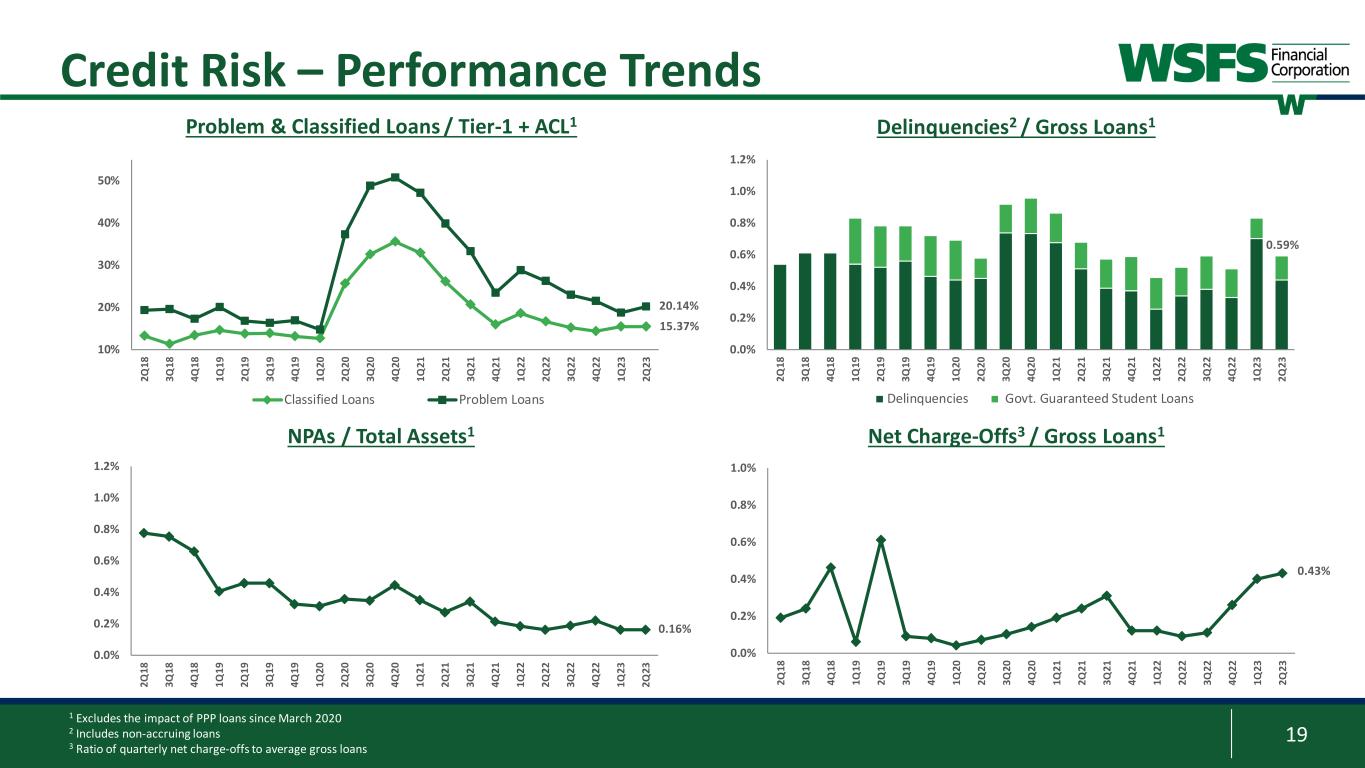 18 1 As of June 30, 2023 2 WSFS IRR model estimates: Static Balance Sheet / Instantaneous Rate Shocks • High % of variable/adjustable rate to total loan portfolio: ~53% • Approximately half of variable rate loans tied to 30- day LIBOR/SOFR • High % core deposits: 90%; high % non-interest bearing and low-interest DDA: 52% • Solid brand and position / strong and diversified low-cost funding across all lines of business • Assumes an interest-bearing deposit beta of approximately 34% Interest Rate Risk1,2 WSJ Prime @ 8.25% Balance Sheet Drivers12-Month IRR BPs change NII Impact (%) NII Impact ($) +100 5.8% $45.3 million +50 2.9% $22.6 million +25 1.4% $11.3 million Static Base -25 (1.4%) ($11.2 million) -50 (2.9%) ($22.6 million) -100 (5.9%) ($46.2 million)