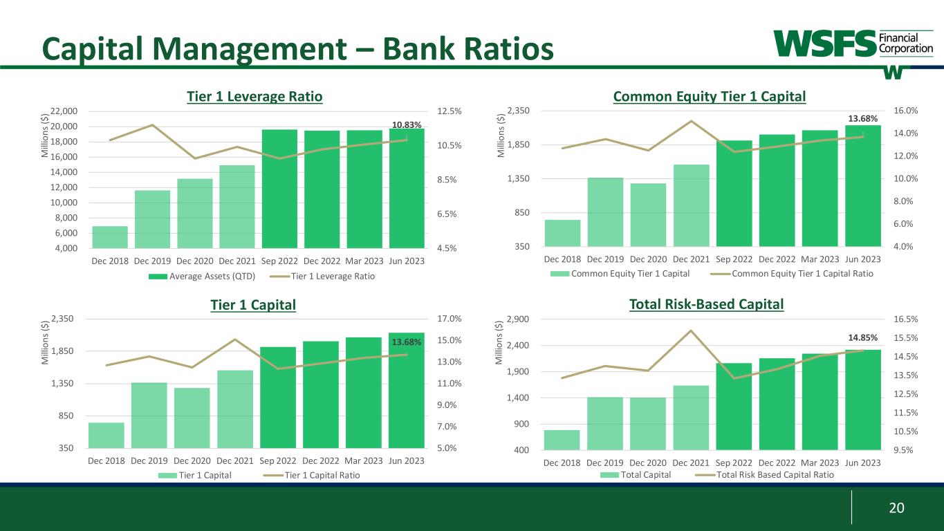 19 0.0% 0.2% 0.4% 0.6% 0.8% 1.0% 1.2% 2Q 18 3Q 18 4Q 18 1Q 19 2Q 19 3Q 19 4Q 19 1Q 20 2Q 20 3Q 20 4Q 20 1Q 21 2Q 21 3Q 21 4Q 21 1Q 22 2Q 22 3Q 22 4Q 22 1Q 23 2Q 23 Delinquencies Govt. Guaranteed Student Loans 0.0% 0.2% 0.4% 0.6% 0.8% 1.0% 1.2% 2Q 18 3Q 18 4Q 18 1Q 19 2Q 19 3Q 19 4Q 19 1Q 20 2Q 20 3Q 20 4Q 20 1Q 21 2Q 21 3Q 21 4Q 21 1Q 22 2Q 22 3Q 22 4Q 22 1Q 23 2Q 23 0.0% 0.2% 0.4% 0.6% 0.8% 1.0% 2Q 18 3Q 18 4Q 18 1Q 19 2Q 19 3Q 19 4Q 19 1Q 20 2Q 20 3Q 20 4Q 20 1Q 21 2Q 21 3Q 21 4Q 21 1Q 22 2Q 22 3Q 22 4Q 22 1Q 23 2Q 23 10% 20% 30% 40% 50% 2Q 18 3Q 18 4Q 18 1Q 19 2Q 19 3Q 19 4Q 19 1Q 20 2Q 20 3Q 20 4Q 20 1Q 21 2Q 21 3Q 21 4Q 21 1Q 22 2Q 22 3Q 22 4Q 22 1Q 23 2Q 23 Classified Loans Problem Loans Delinquencies2 / Gross Loans1 Net Charge-Offs3 / Gross Loans1 1 Excludes the impact of PPP loans since March 2020 2 Includes non-accruing loans 3 Ratio of quarterly net charge-offs to average gross loans Problem & Classified Loans / Tier-1 + ACL1 NPAs / Total Assets1 0.16% Credit Risk – Performance Trends 20.14% 15.37% 0.43% 0.59%