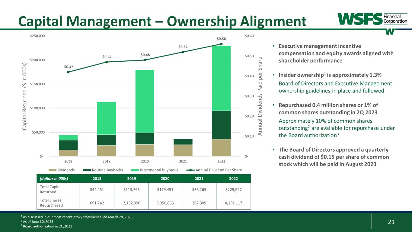 20 10.83% 4.5% 6.5% 8.5% 10.5% 12.5% 4,000 6,000 8,000 10,000 12,000 14,000 16,000 18,000 20,000 22,000 Dec 2018 Dec 2019 Dec 2020 Dec 2021 Sep 2022 Dec 2022 Mar 2023 Jun 2023 Average Assets (QTD) Tier 1 Leverage Ratio 14.85% 9.5% 10.5% 11.5% 12.5% 13.5% 14.5% 15.5% 16.5% 400 900 1,400 1,900 2,400 2,900 Dec 2018 Dec 2019 Dec 2020 Dec 2021 Sep 2022 Dec 2022 Mar 2023 Jun 2023 Total Capital Total Risk Based Capital Ratio 13.68% 5.0% 7.0% 9.0% 11.0% 13.0% 15.0% 17.0% 350 850 1,350 1,850 2,350 Dec 2018 Dec 2019 Dec 2020 Dec 2021 Sep 2022 Dec 2022 Mar 2023 Jun 2023 Tier 1 Capital Tier 1 Capital Ratio Capital Management – Bank Ratios Tier 1 Leverage Ratio Common Equity Tier 1 Capital Tier 1 Capital Total Risk-Based Capital M ill io ns ($ ) M ill io ns M ill io ns ($ ) M ill io ns ($ ) 13.68% 4.0% 6.0% 8.0% 10.0% 12.0% 14.0% 16.0% 350 850 1,350 1,850 2,350 Dec 2018 Dec 2019 Dec 2020 Dec 2021 Sep 2022 Dec 2022 Mar 2023 Jun 2023 Common Equity Tier 1 Capital Common Equity Tier 1 Capital Ratio M ill io ns ($ )