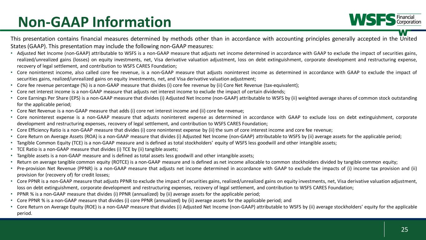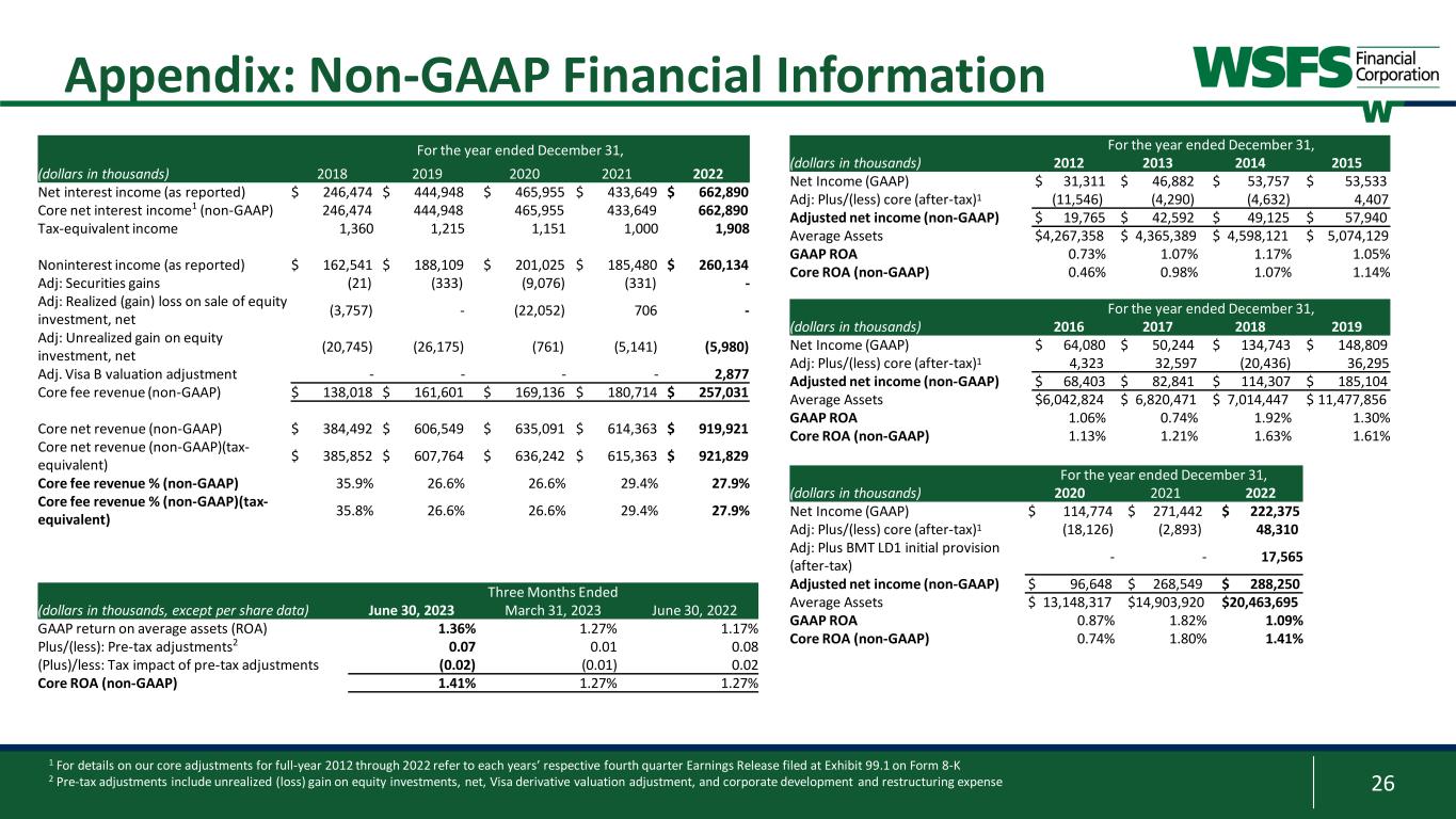 25 Non-GAAP Information This presentation contains financial measures determined by methods other than in accordance with accounting principles generally accepted in the United States (GAAP). This presentation may include the following non-GAAP measures: • Adjusted Net Income (non-GAAP) attributable to WSFS is a non-GAAP measure that adjusts net income determined in accordance with GAAP to exclude the impact of securities gains, realized/unrealized gains (losses) on equity investments, net, Visa derivative valuation adjustment, loss on debt extinguishment, corporate development and restructuring expense, recovery of legal settlement, and contribution to WSFS CARES Foundation; • Core noninterest income, also called core fee revenue, is a non-GAAP measure that adjusts noninterest income as determined in accordance with GAAP to exclude the impact of securities gains, realized/unrealized gains on equity investments, net, and Visa derivative valuation adjustment; • Core fee revenue percentage (%) is a non-GAAP measure that divides (i) core fee revenue by (ii) Core Net Revenue (tax-equivalent); • Core net interest income is a non-GAAP measure that adjusts net interest income to exclude the impact of certain dividends; • Core Earnings Per Share (EPS) is a non-GAAP measure that divides (i) Adjusted Net Income (non-GAAP) attributable to WSFS by (ii) weighted average shares of common stock outstanding for the applicable period; • Core Net Revenue is a non-GAAP measure that adds (i) core net interest income and (ii) core fee revenue; • Core noninterest expense is a non-GAAP measure that adjusts noninterest expense as determined in accordance with GAAP to exclude loss on debt extinguishment, corporate development and restructuring expenses, recovery of legal settlement, and contribution to WSFS CARES Foundation; • Core Efficiency Ratio is a non-GAAP measure that divides (i) core noninterest expense by (ii) the sum of core interest income and core fee revenue; • Core Return on Average Assets (ROA) is a non-GAAP measure that divides (i) Adjusted Net Income (non-GAAP) attributable to WSFS by (ii) average assets for the applicable period; • Tangible Common Equity (TCE) is a non-GAAP measure and is defined as total stockholders’ equity of WSFS less goodwill and other intangible assets; • TCE Ratio is a non-GAAP measure that divides (i) TCE by (ii) tangible assets; • Tangible assets is a non-GAAP measure and is defined as total assets less goodwill and other intangible assets; • Return on average tangible common equity (ROTCE) is a non-GAAP measure and is defined as net income allocable to common stockholders divided by tangible common equity; • Pre-provision Net Revenue (PPNR) is a non-GAAP measure that adjusts net income determined in accordance with GAAP to exclude the impacts of (i) income tax provision and (ii) provision for (recovery of) for credit losses; • Core PPNR is a non-GAAP measure that adjusts PPNR to exclude the impact of securities gains, realized/unrealized gains on equity investments, net, Visa derivative valuation adjustment, loss on debt extinguishment, corporate development and restructuring expenses, recovery of legal settlement, and contribution to WSFS CARES Foundation; • PPNR % is a non-GAAP measure that divides (i) PPNR (annualized) by (ii) average assets for the applicable period; • Core PPNR % is a non-GAAP measure that divides (i) core PPNR (annualized) by (ii) average assets for the applicable period; and • Core Return on Average Equity (ROE) is a non-GAAP measure that divides (i) Adjusted Net Income (non-GAAP) attributable to WSFS by (ii) average stockholders’ equity for the applicable period.