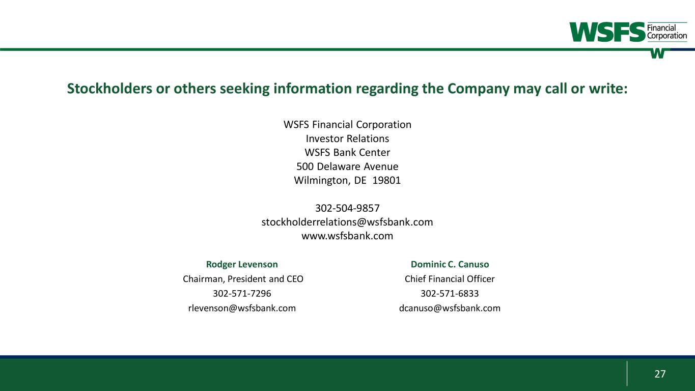 27 Stockholders or others seeking information regarding the Company may call or write: WSFS Financial Corporation Investor Relations WSFS Bank Center 500 Delaware Avenue Wilmington, DE 19801 302-504-9857 stockholderrelations@wsfsbank.com www.wsfsbank.com Rodger Levenson Chairman, President and CEO 302-571-7296 rlevenson@wsfsbank.com Dominic C. Canuso Chief Financial Officer 302-571-6833 dcanuso@wsfsbank.com