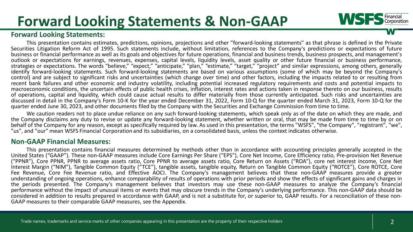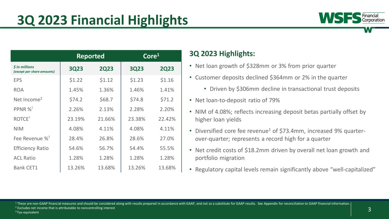 2 Forward Looking Statements & Non-GAAP Forward Looking Statements: This presentation contains estimates, predictions, opinions, projections and other "forward-looking statements" as that phrase is defined in the Private Securities Litigation Reform Act of 1995. Such statements include, without limitation, references to the Company's predictions or expectations of future business or financial performance as well as its goals and objectives for future operations, financial and business trends, business prospects, and management's outlook or expectations for earnings, revenues, expenses, capital levels, liquidity levels, asset quality or other future financial or business performance, strategies or expectations. The words “believe,” “expect,” “anticipate,” “plan,” “estimate,” “target,” “project” and similar expressions, among others, generally identify forward-looking statements. Such forward-looking statements are based on various assumptions (some of which may be beyond the Company's control) and are subject to significant risks and uncertainties (which change over time) and other factors, including the impacts related to or resulting from recent bank failures and other economic and industry volatility, including potential increased regulatory requirements and costs and potential impacts to macroeconomic conditions, the uncertain effects of public health crises, inflation, interest rates and actions taken in response thereto on our business, results of operations, capital and liquidity, which could cause actual results to differ materially from those currently anticipated. Such risks and uncertainties are discussed in detail in the Company's Form 10-K for the year ended December 31, 2022, Form 10-Q for the quarter ended March 31, 2023, Form 10-Q for the quarter ended June 30, 2023, and other documents filed by the Company with the Securities and Exchange Commission from time to time. We caution readers not to place undue reliance on any such forward-looking statements, which speak only as of the date on which they are made, and the Company disclaims any duty to revise or update any forward-looking statement, whether written or oral, that may be made from time to time by or on behalf of the Company for any reason, except as specifically required by law. As used in this presentation, the terms "WSFS", "the Company", "registrant", "we", "us", and "our" mean WSFS Financial Corporation and its subsidiaries, on a consolidated basis, unless the context indicates otherwise. Non-GAAP Financial Measures: This presentation contains financial measures determined by methods other than in accordance with accounting principles generally accepted in the United States (“GAAP”). These non-GAAP measures include Core Earnings Per Share (“EPS”), Core Net Income, Core Efficiency ratio, Pre-provision Net Revenue (“PPNR”), Core PPNR, PPNR to average assets ratio, Core PPNR to average assets ratio, Core Return on Assets (“ROA”), core net interest income, Core Net Interest Margin (“NIM”), Tangible Common Equity (“TCE”), tangible assets, tangible equity, Return on Tangible Common Equity (“ROTCE”), Core ROTCE, Core Fee Revenue, Core Fee Revenue ratio, and Effective AOCI. The Company’s management believes that these non-GAAP measures provide a greater understanding of ongoing operations, enhance comparability of results of operations with prior periods and show the effects of significant gains and charges in the periods presented. The Company’s management believes that investors may use these non-GAAP measures to analyze the Company’s financial performance without the impact of unusual items or events that may obscure trends in the Company’s underlying performance. This non-GAAP data should be considered in addition to results prepared in accordance with GAAP, and is not a substitute for, or superior to, GAAP results. For a reconciliation of these non- GAAP measures to their comparable GAAP measures, see the Appendix. Trade names, trademarks and service marks of other companies appearing in this presentation are the property of their respective holders.