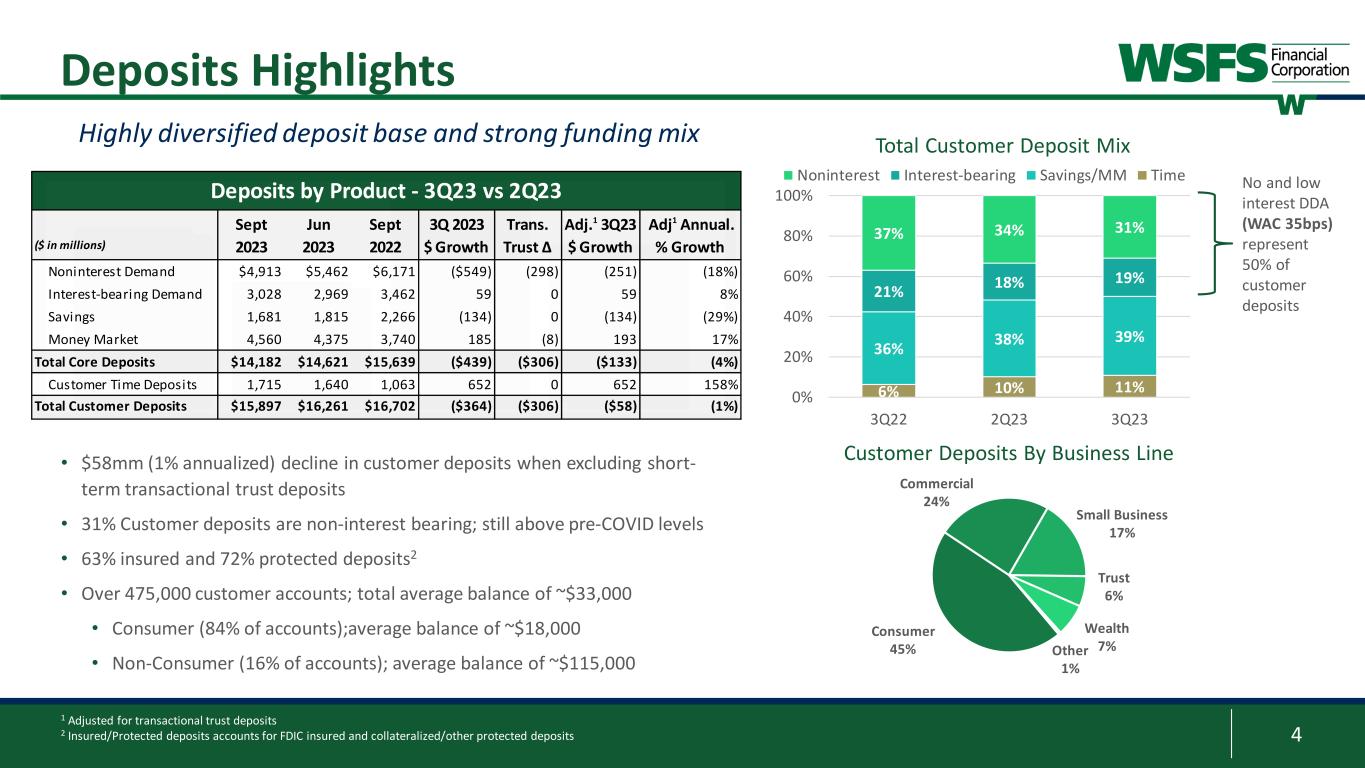 3 3Q 2023 Financial Highlights 3Q 2023 Highlights: • Net loan growth of $328mm or 3% from prior quarter • Customer deposits declined $364mm or 2% in the quarter • Driven by $306mm decline in transactional trust deposits • Net loan-to-deposit ratio of 79% • NIM of 4.08%; reflects increasing deposit betas partially offset by higher loan yields • Diversified core fee revenue1 of $73.4mm, increased 9% quarter- over-quarter; represents a record high for a quarter • Net credit costs of $18.2mm driven by overall net loan growth and portfolio migration • Regulatory capital levels remain significantly above “well-capitalized” 1 These are non-GAAP financial measures and should be considered along with results prepared in accordance with GAAP, and not as a substitute for GAAP results. See Appendix for reconciliation to GAAP financial information. 2 Excludes net income that is attributable to noncontrolling interest 3 Tax-equivalent Reported Core1 $ in millions (except per share amounts) 3Q23 2Q23 3Q23 2Q23 EPS $1.22 $1.12 $1.23 $1.16 ROA 1.45% 1.36% 1.46% 1.41% Net Income2 $74.2 $68.7 $74.8 $71.2 PPNR %1 2.26% 2.13% 2.28% 2.20% ROTCE1 23.19% 21.66% 23.38% 22.42% NIM 4.08% 4.11% 4.08% 4.11% Fee Revenue %3 28.4% 26.8% 28.6% 27.0% Efficiency Ratio 54.6% 56.7% 54.4% 55.5% ACL Ratio 1.28% 1.28% 1.28% 1.28% Bank CET1 13.26% 13.68% 13.26% 13.68%