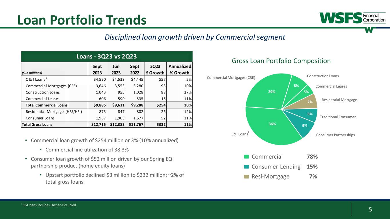 4 Deposits Highlights Consumer 45% Commercial 24% Small Business 17% Trust 6% Wealth 7%Other 1% Total Customer Deposit Mix 6% 10% 11% 36% 38% 39% 21% 18% 19% 37% 34% 31% 0% 20% 40% 60% 80% 100% 3Q22 2Q23 3Q23 Noninterest Interest-bearing Savings/MM Time No and low interest DDA (WAC 35bps) represent 50% of customer deposits ($ in millions) Sept 2023 Jun 2023 Sept 2022 3Q 2023 $ Growth Trans. Trust Δ Adj.1 3Q23 $ Growth Adj1 Annual. % Growth Noninterest Demand $4,913 $5,462 $6,171 ($549) (298) (251) (18%) Interest-bearing Demand 3,028 2,969 3,462 59 0 59 8% Savings 1,681 1,815 2,266 (134) 0 (134) (29%) Money Market 4,560 4,375 3,740 185 (8) 193 17% Total Core Deposits $14,182 $14,621 $15,639 ($439) ($306) ($133) (4%) Customer Time Deposits 1,715 1,640 1,063 652 0 652 158% Total Customer Deposits $15,897 $16,261 $16,702 ($364) ($306) ($58) (1%) Deposits by Product - 3Q23 vs 2Q23 • $58mm (1% annualized) decline in customer deposits when excluding short- term transactional trust deposits • 31% Customer deposits are non-interest bearing; still above pre-COVID levels • 63% insured and 72% protected deposits2 • Over 475,000 customer accounts; total average balance of ~$33,000 • Consumer (84% of accounts);average balance of ~$18,000 • Non-Consumer (16% of accounts); average balance of ~$115,000 Customer Deposits By Business Line 1 Adjusted for transactional trust deposits 2 Insured/Protected deposits accounts for FDIC insured and collateralized/other protected deposits Highly diversified deposit base and strong funding mix